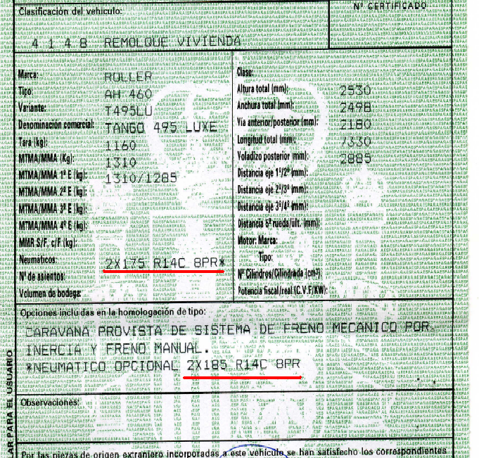 Otra historia que hace tiempo quería comentaros es que tenemos dos tarjetas de inspección técnica iguales salvo en un detalle. En una de ellas en el apartado ruedas pone 2X185R14C, y en la otra 2X175R14C y una circular en la que Sun Roller dice que una segunda ficha técnica debe acompañar a la primera puesto que en ésta última constaba otra numeración de ruedas distinta a la que corresponde. Aunque os parezca mentira no he podido averiguar cúal es la primera por la fecha de emisión, ya que en una de ellas no aparece. Como las ruedas actuales de la caravana son 175, deduzco que la 2ª ficha técnica es la que pone esta numeración (175R14C) y es, por tanto, la válida.