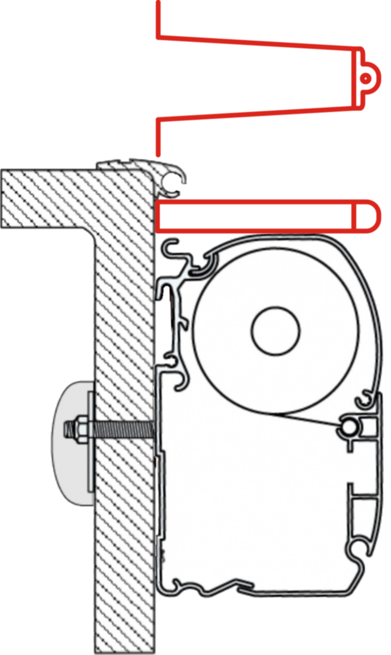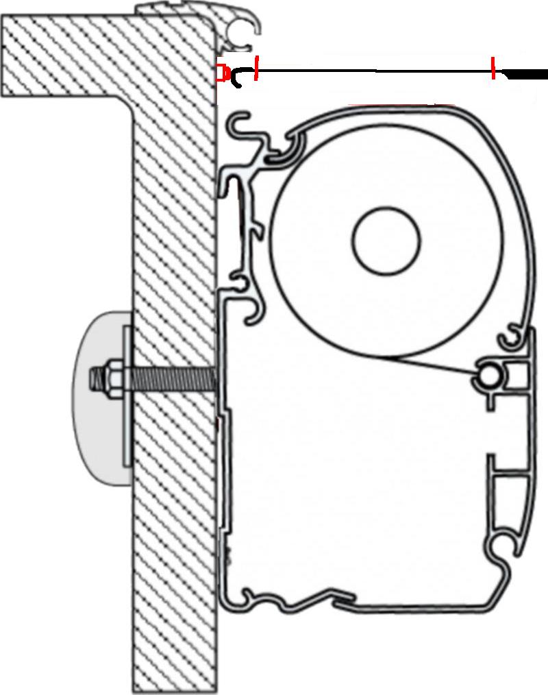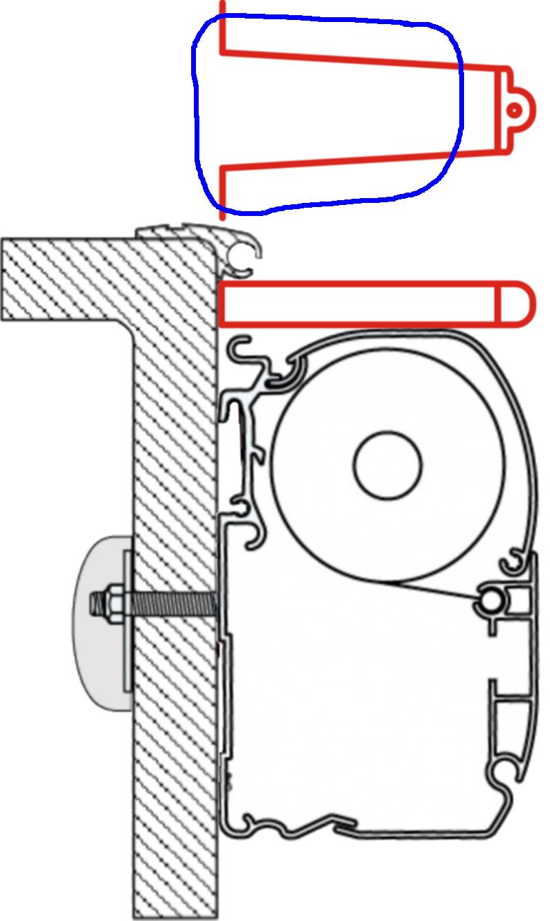 Las dos figuras rojas son la misma, vista desde un lado y vista desde arriba, iría atornillada la chapa de la caravana y remachada al toldo.