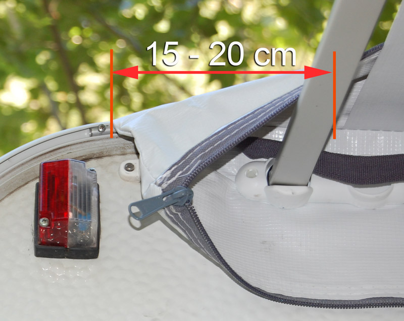 Sólo añadir que no todo el ancho del caravanstore lo ocupa el eje rígido del toldo, hay unos 5 o 6 cm por cada lado hasta el borde exterior de la bolsa, lo que puede quedar invadiendo algo la parte curva de la guía... también deberías tener en cuenta que no te tape ninguno de los pilotos superiores de gálibo.