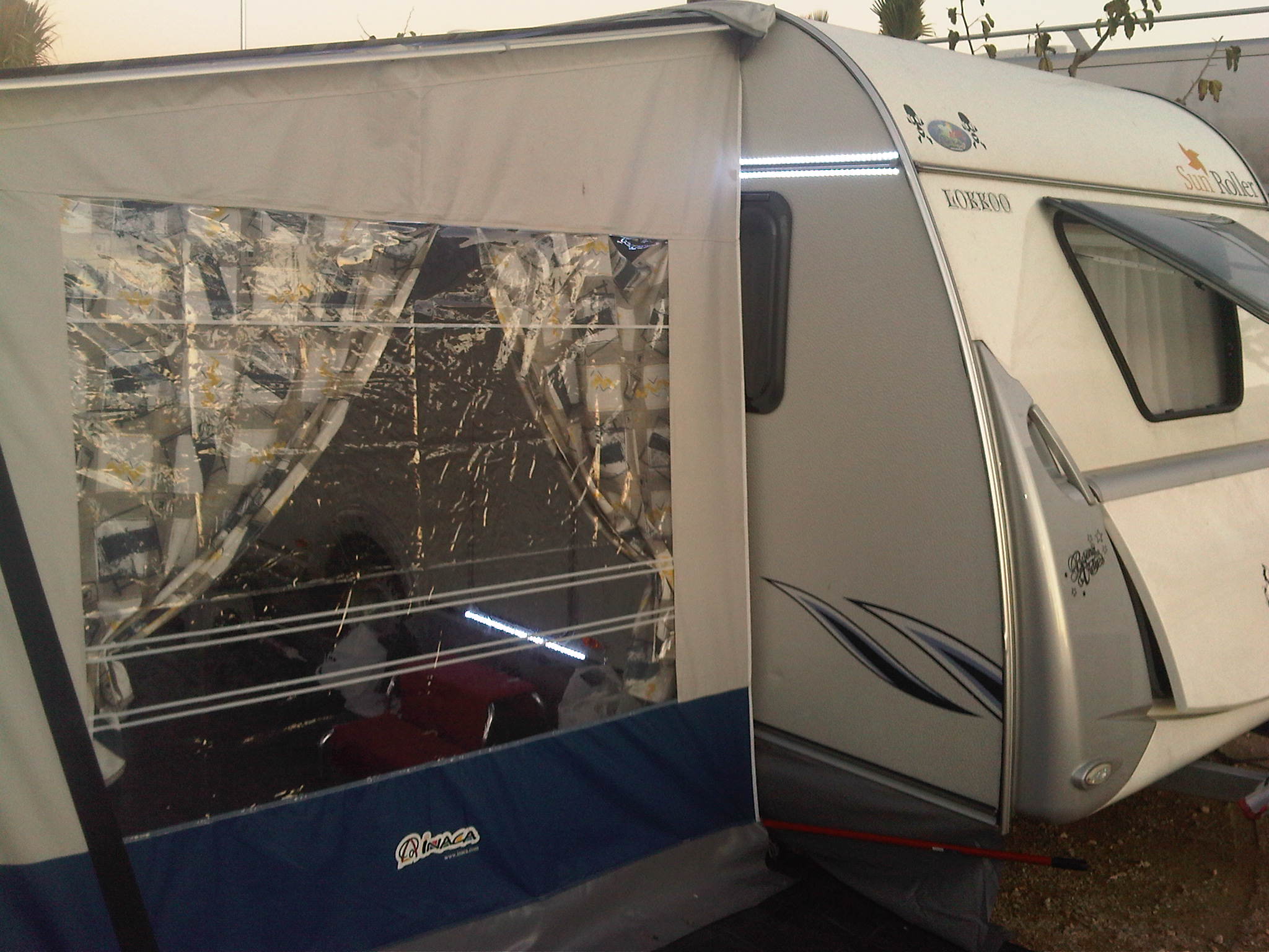 Si miras el marco de la puerta desde el interior, y por la parte de arriba, y apartas la goma que solapa con la madera, verás que tiene algo de holgura con la pared de la caravana, no llegará a verse el exterior, por supuesto, porque si no, te habría entrado el agua, pero con una broca un poco inclinada fácilmente comunicarás interior con exterior, y como el plafón va por fuera completamente encima del marco de la puerta, se sella, y por dentro puedes llevar el cable por el perímetro del marco de la puerta escondido en la holgura detrás de la goma, y llevarlo a algún interruptor que hayas puesto.