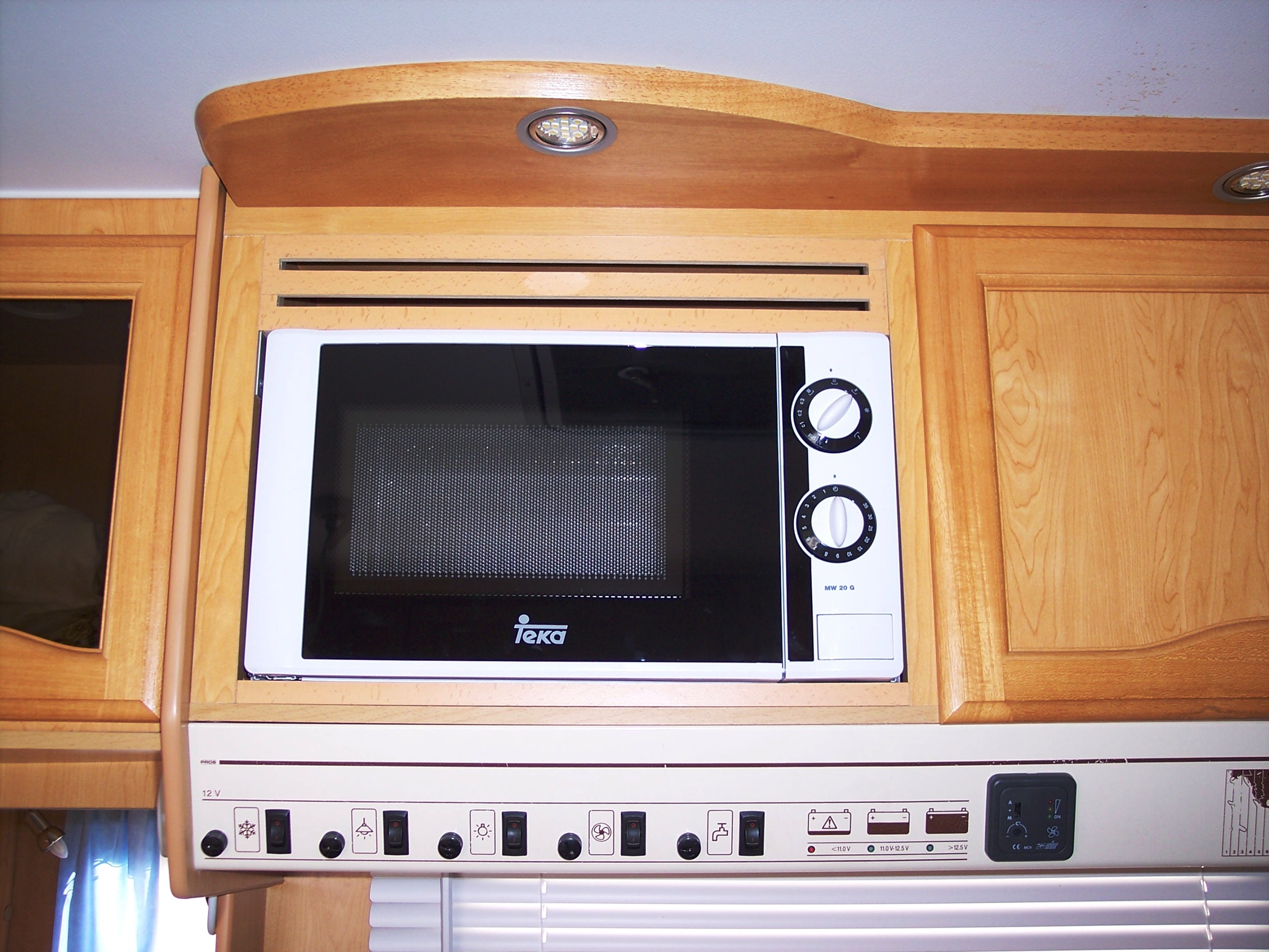 Me parece recordar que los de la lámpara que dices son los dos halógenos empotrados que están en el techo, encima del micro, y el de la bombilla encendida, es el que le da corriente a las luces de 12v interiores, la central del comedor y la de la habitación, cuando está activado solo te queda tirar de la cuerdecita. Yo creo que tengo por algún lado un catálogo de mi Portofino, a ver si luego lo encuentro.
