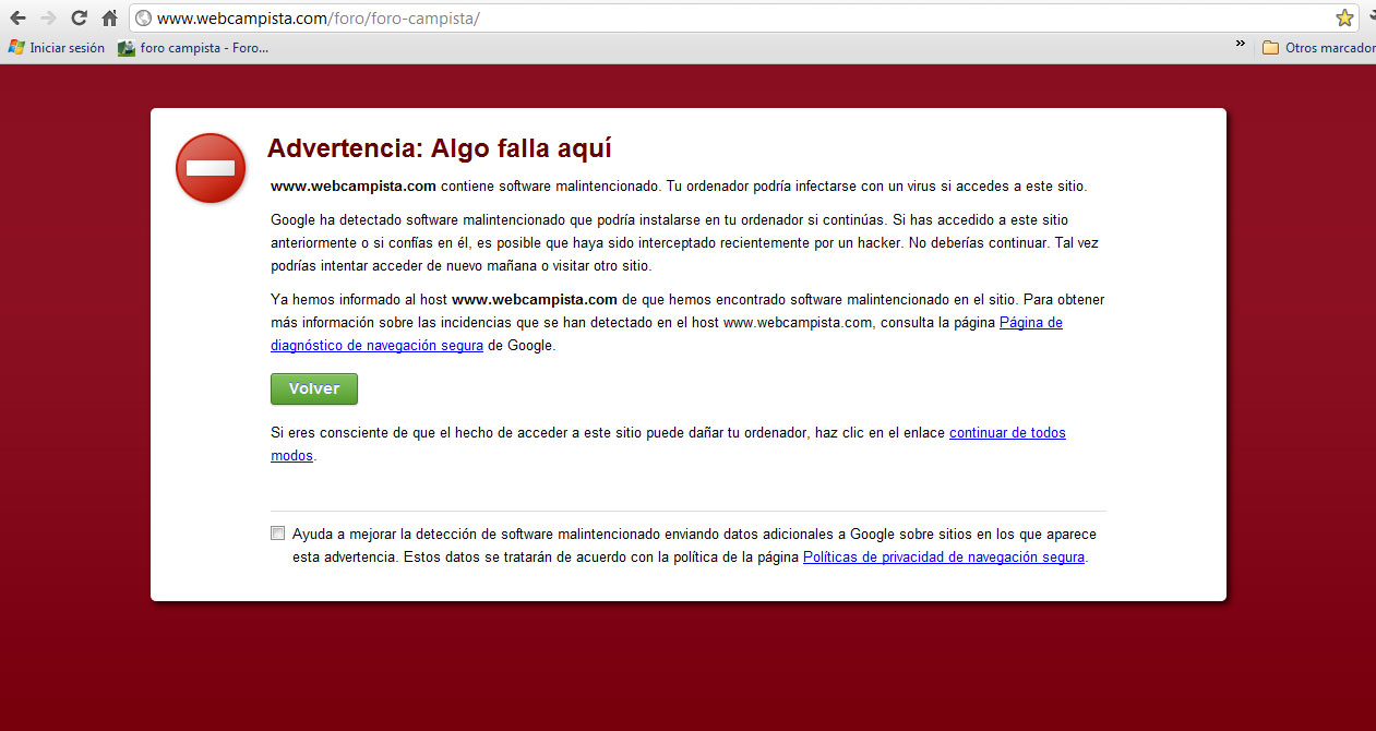 Como os he dicho arriba, podéis entrar perfectamente en webcampista, el troyano fue destruido por el webmaster, y si clicais en la parte del texto donde pone "continuar de todos modos" podéis entrar.. ademas si usáis internet explorer no os da este error y podéis entrar directamente.