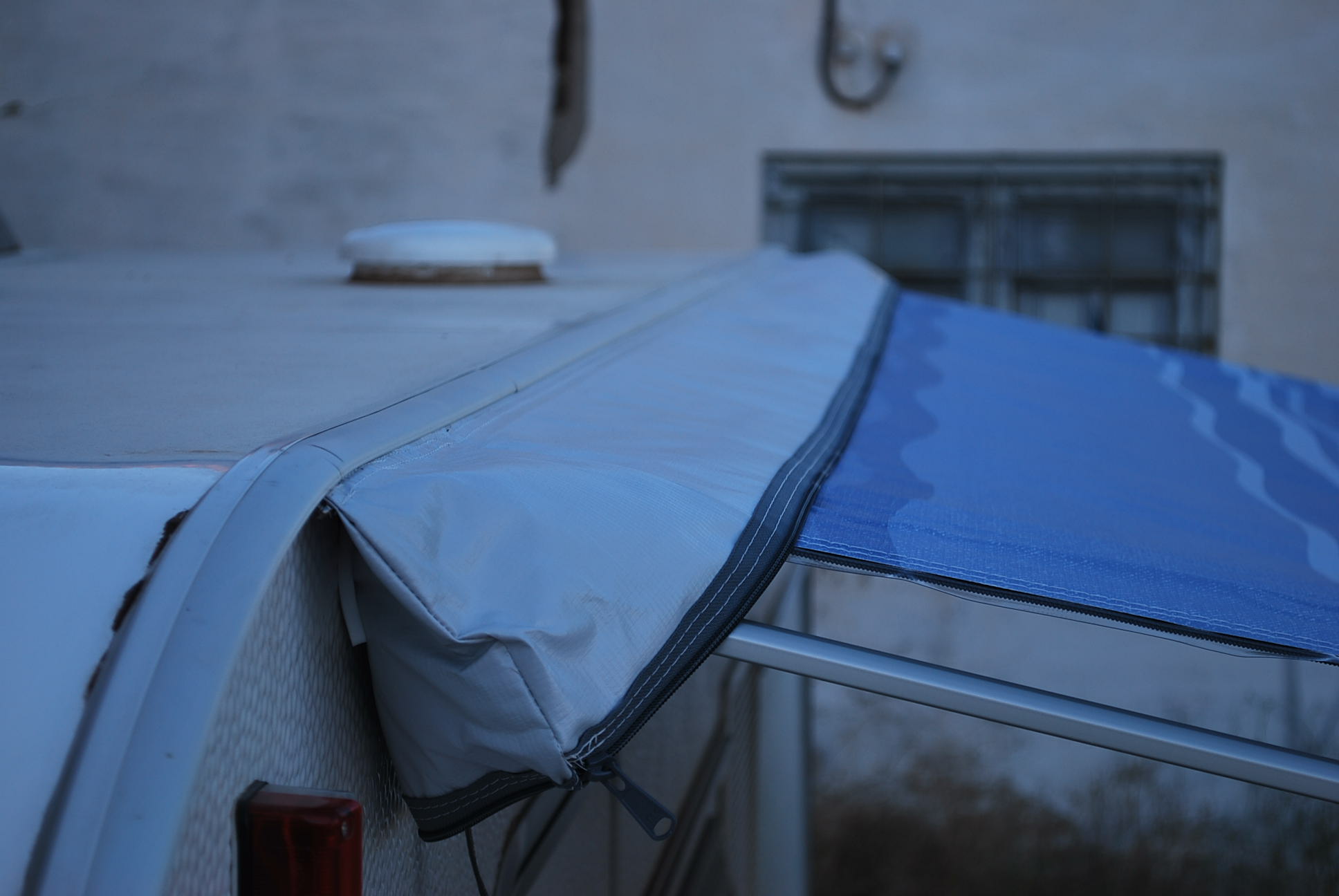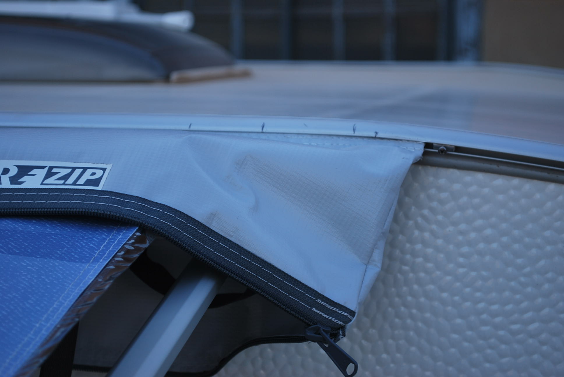 Hay otra cosa a tener en cuenta, que después de donde acaba la lona en la parte delantera sobresalen las dos puntas del cilindro que va sujeto el toldo. Al enrollarlo se podría llegar a arrugar en los extremos, tensar en exceso la lona respecto a su sujección al nervio, y recaer todo el peso del Cs en las dos puntas, y no repartido a lo largo de él.....