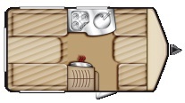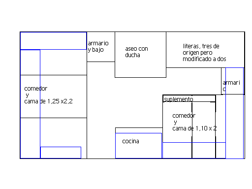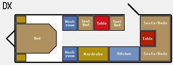 Luego estaría la distribución sin niños, que lo único que cambia es que no hay literas y si otro pequeño comedor que a su vez se convierte en cama. La distribución es la siguiente: