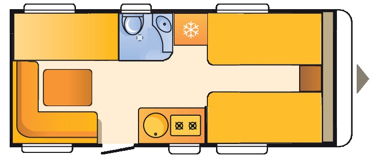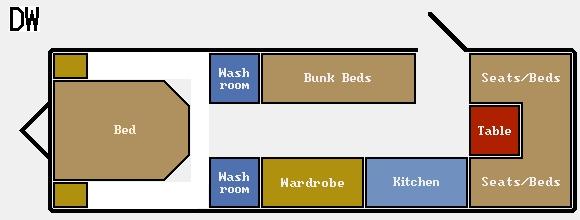 Psra nosotros y despues de ver muchas caravanas y distribuciones diferentes, y a la vez buscando una caravana no muy grande pensamos que la mejor era la de nuestra Fiesta de 4.70, ya que recogia la cama, con tres literas y un pequeño comedor para los dias malos o demasiado calurosos, os pongo un pequeño dobujo, aunque las cotas no son las correctas se asemeja bastante, tiene espacio para cambiarse y sobre todo muchisima luz. Aunque ha recibido dos pequeñas modificaciones, el comedor lo transformamos en cama fija y quitamos una litera para mayor espacio para los crios. En azul los armarios superiores