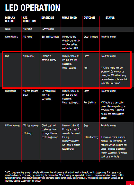El Led rojo se queda encendido / El ATC esta inactivo/ Se puede continuar la marcha, pero no actuara / desconecte la piña durante 5 segundos y vuelva a conectar/ si sigue rojo / se puede seguir conduciendo pero el ATC no funcionara.. siga las instrucciones de abajo.
