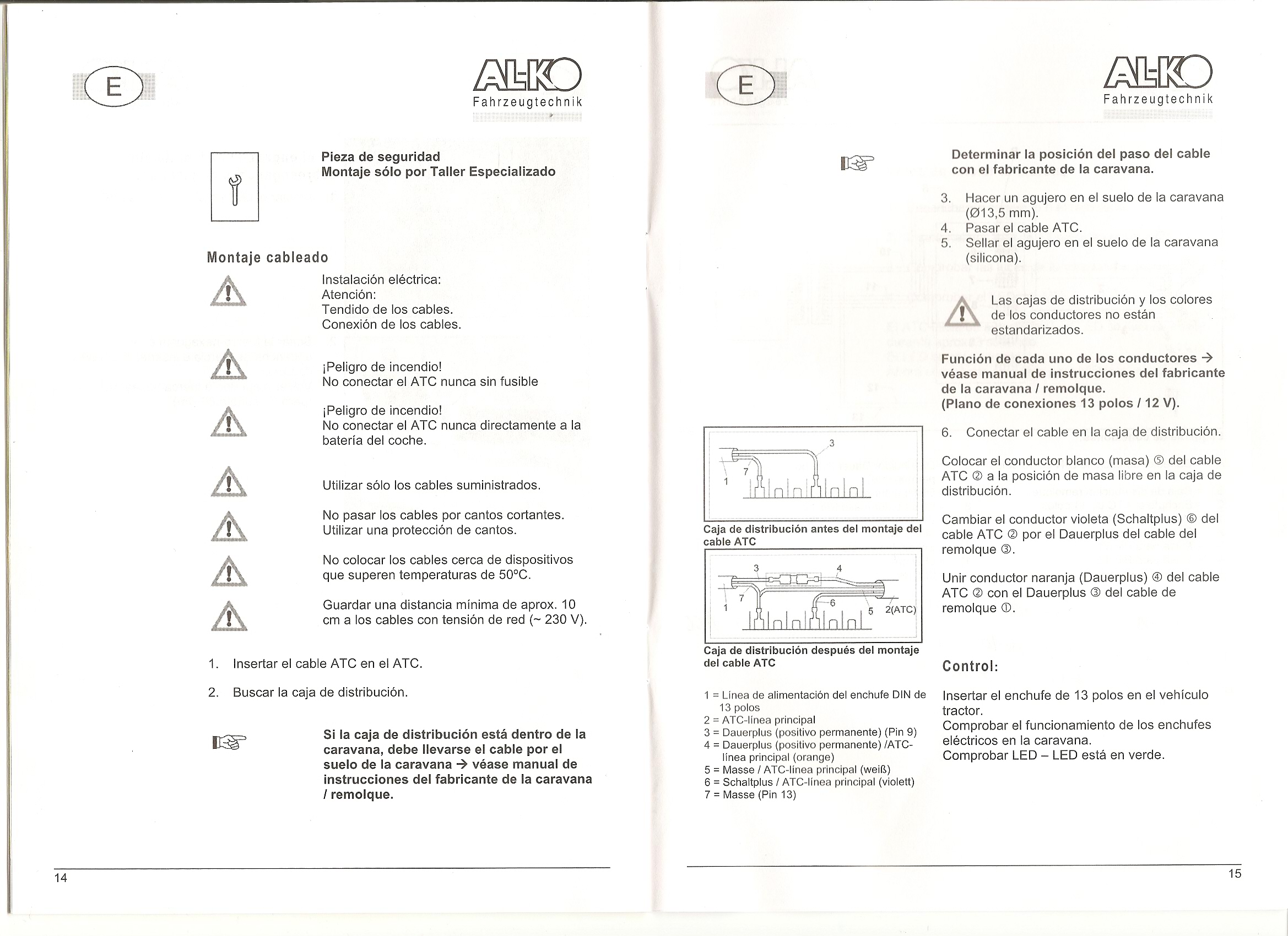 Los dos cables naranjas y los dos morados del ATC al positivo directo que viene del coche, azul-rojo en la caja de conexiones de debajo de la caravana.