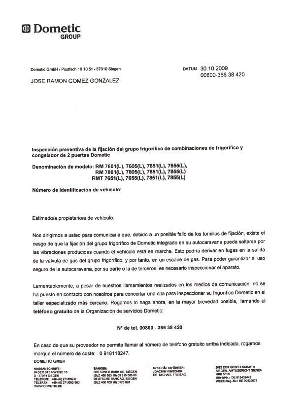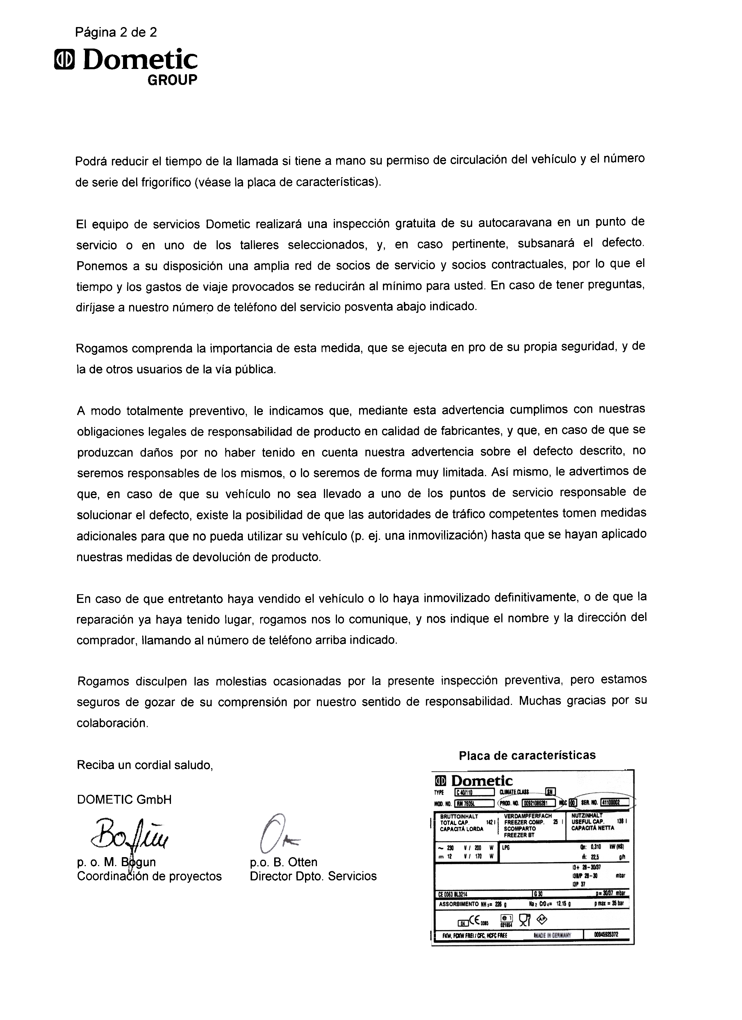 Mirar que carta he recibido de Dometic, he hablado con ellos y me han dado el numero de teleforno de un taller en Getafe, he estado hablando con ellos y me han dicho que lleve la caravana para ponerle una brida y unos tornollos nuevos al frigorifico.