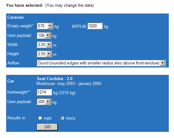 El dato de "User payload" tanto de caravana como de coche, son los estimados de peso de la carga, en el caso de la cv lo que lleves dentro, en el del coche el de los pasajeros. Estímalos y pon los más cercanos.