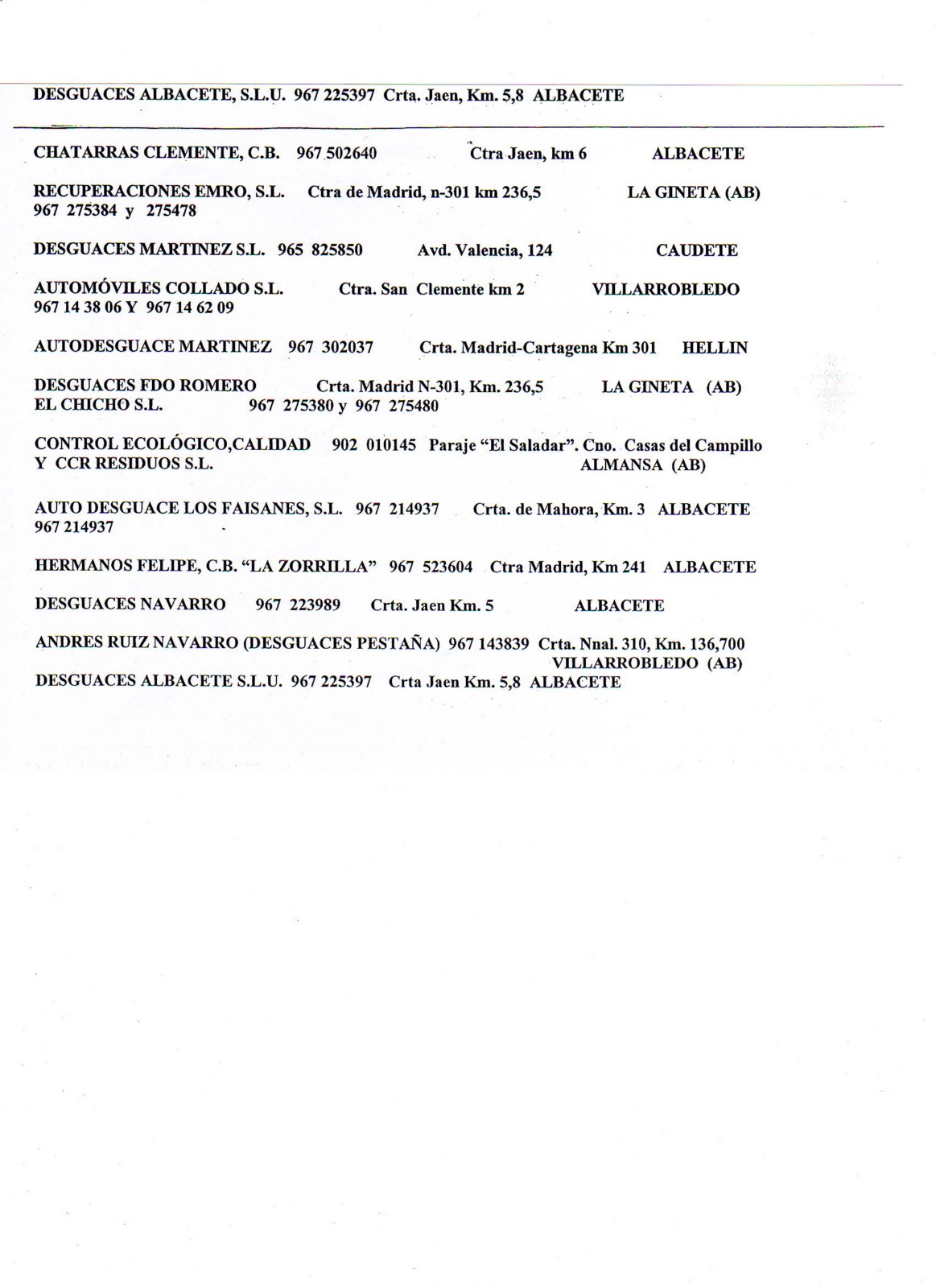 Aquí os doy un documento, a modo de ejemplo, donde se relacionan los distintos centros de desguace de la provincia de Albacete donde entregaremos el vehículo y recibiremos el correspondiente certificado. Este documento lo dan también en la misma oficina de tráfico.