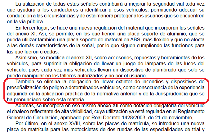 ( Entiendo que esto seria vigente desde el 6 de Agosto de 1999 ) y tambien entiendo que una motocicleta y un ciclomotor ( es un vehiculo a motor ) Tambien esta obligada a llevar un extintor. ( donde colocarlo eso ya no lo se ) Y un turismo es un vehiculo a motor ( hasta 5 personas ) por que apartir de 9 Personas ya se considera Autobus.