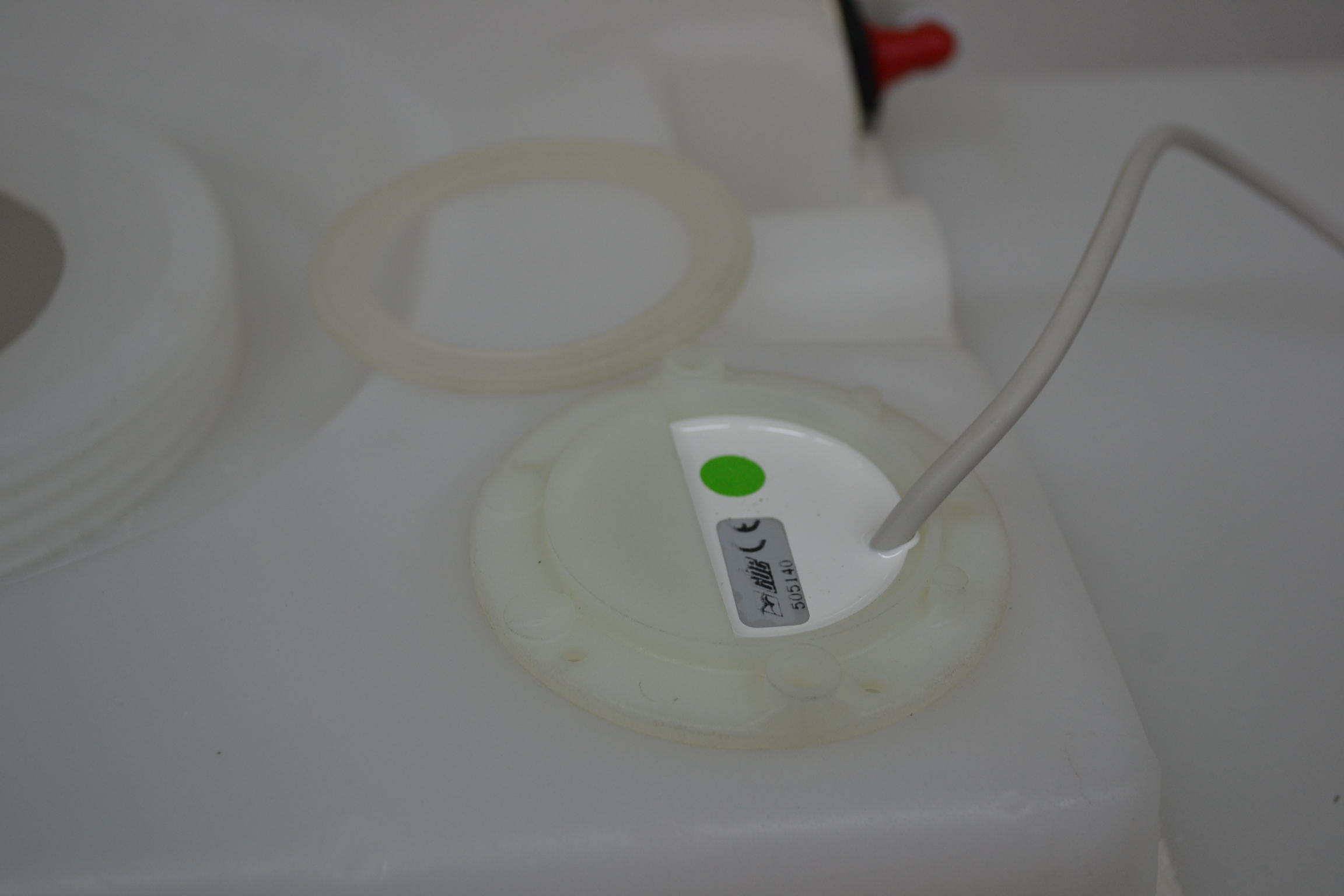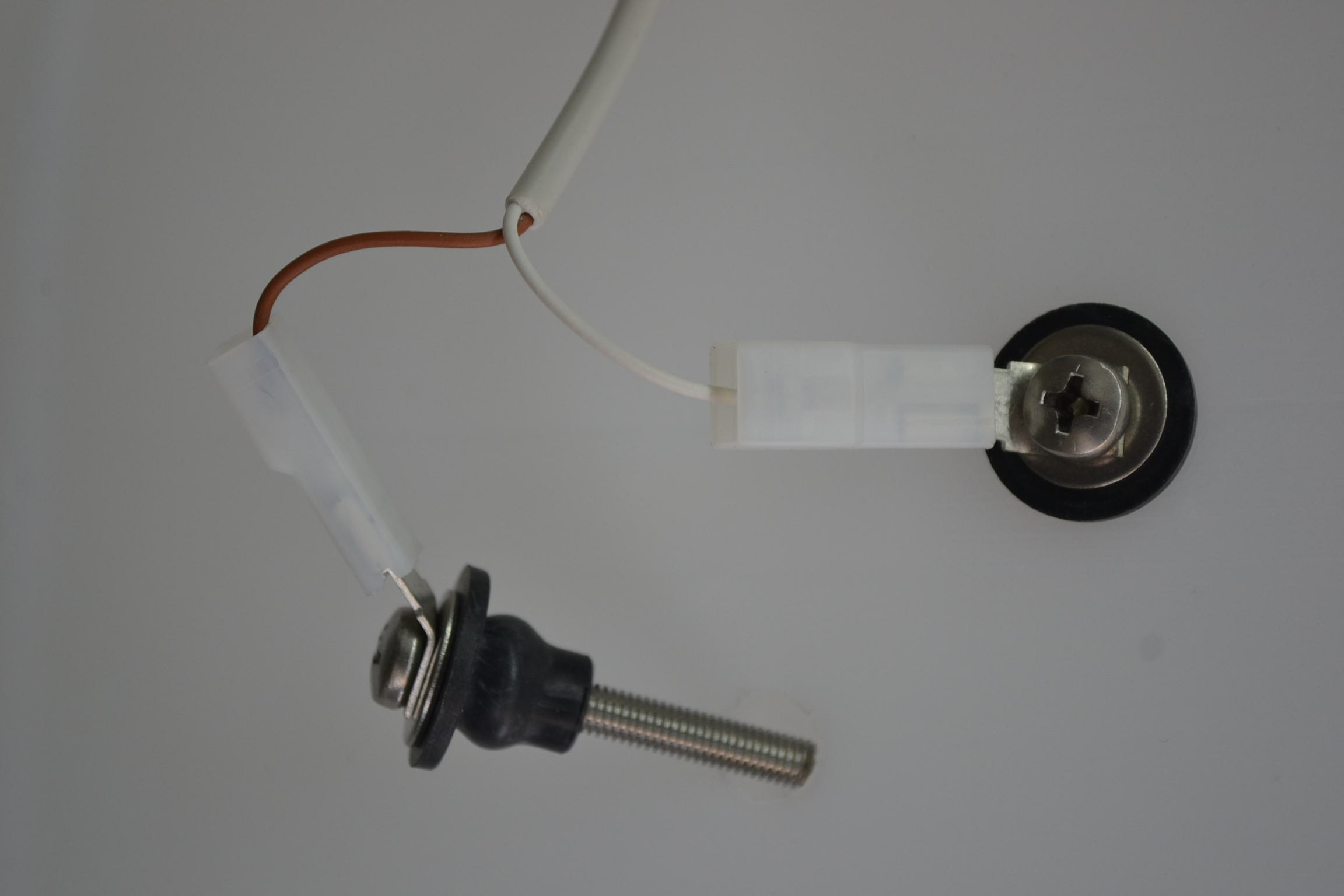 Despues comprobe las sondas para el deposito de aguas grises. Su funcionamiento es muy sencillo. Dispone de 2 tornillos que roscan unos casquillos de goma; se intercala una arandela y la conexion electrica; al apretar el tornillo la goma se retrae quedando ajustada al orificio que se ha hecho en el deposito. Despues se conectan ambas conexiones a cada sonda.
