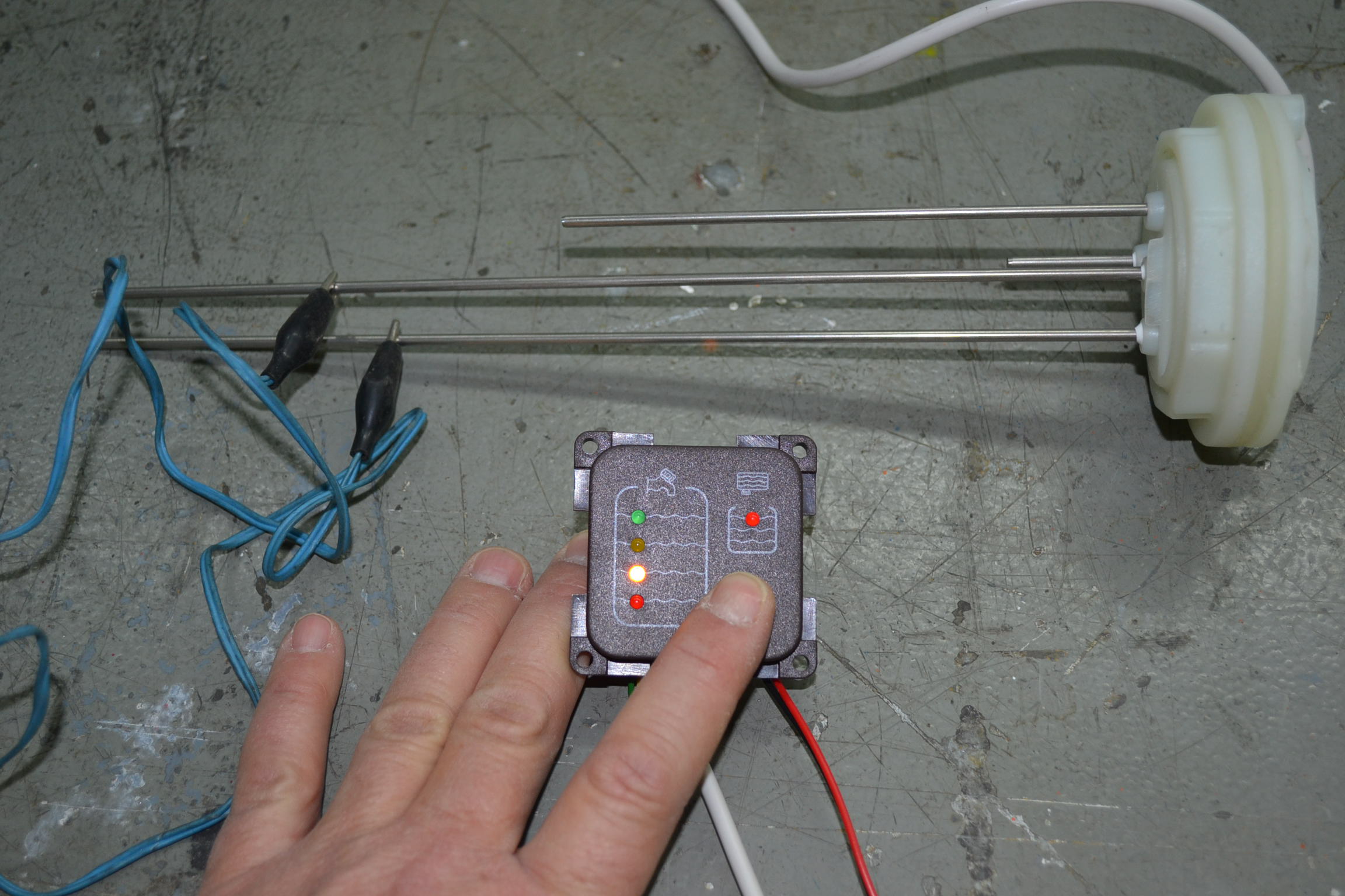 Conecte las clavijas en sus respectivos lugares ( una al indicador y la otra a las varillas-sonda ). Comprobe que, al pulsar el boton de testeo, si no se cierra circuito en ninguna de las varillas se ilumina el led inferior de color rojo ( indica que esta al minimo o no queda agua en el deposito):
