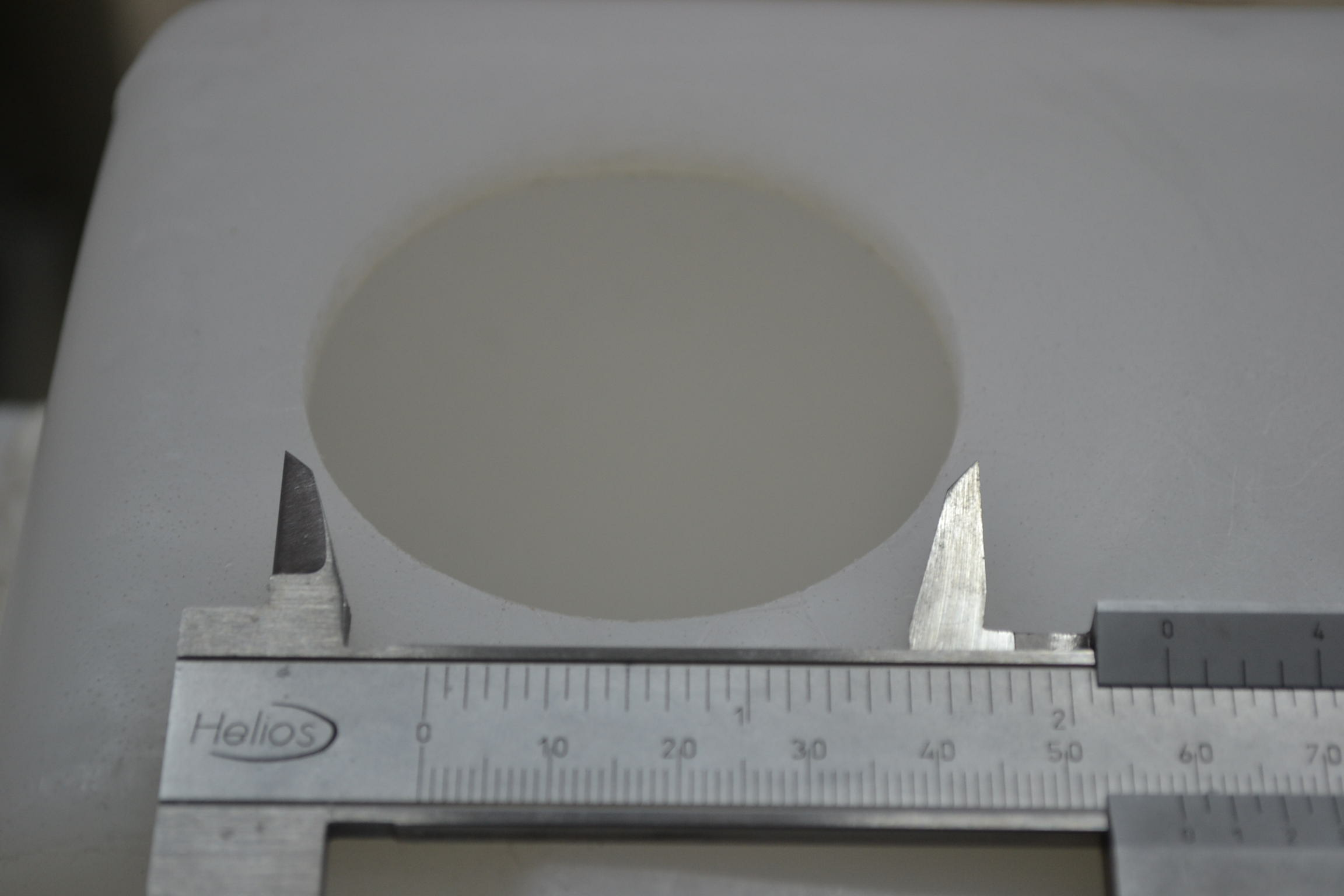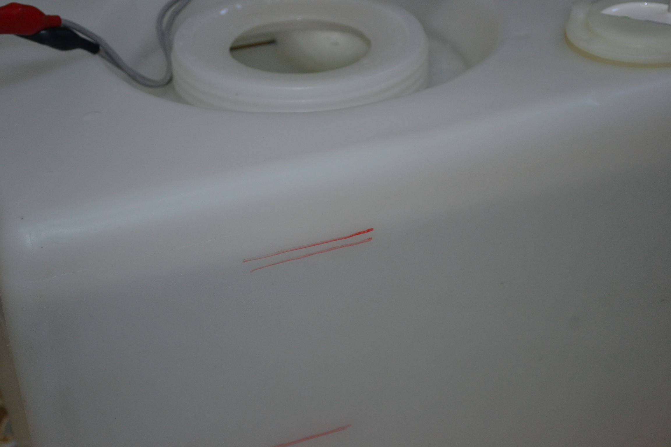 Hice 2 agujeros en un bidon para comprobar el ajuste de las gomas. Hay que hacerlos donde crea uno conveniente que se indique el maximo. Entre la sonda superior y la inferior debe haber una distancia de 20 a 40 mm tanto en altura como en anchura. Yo los hice a 30 mm:
