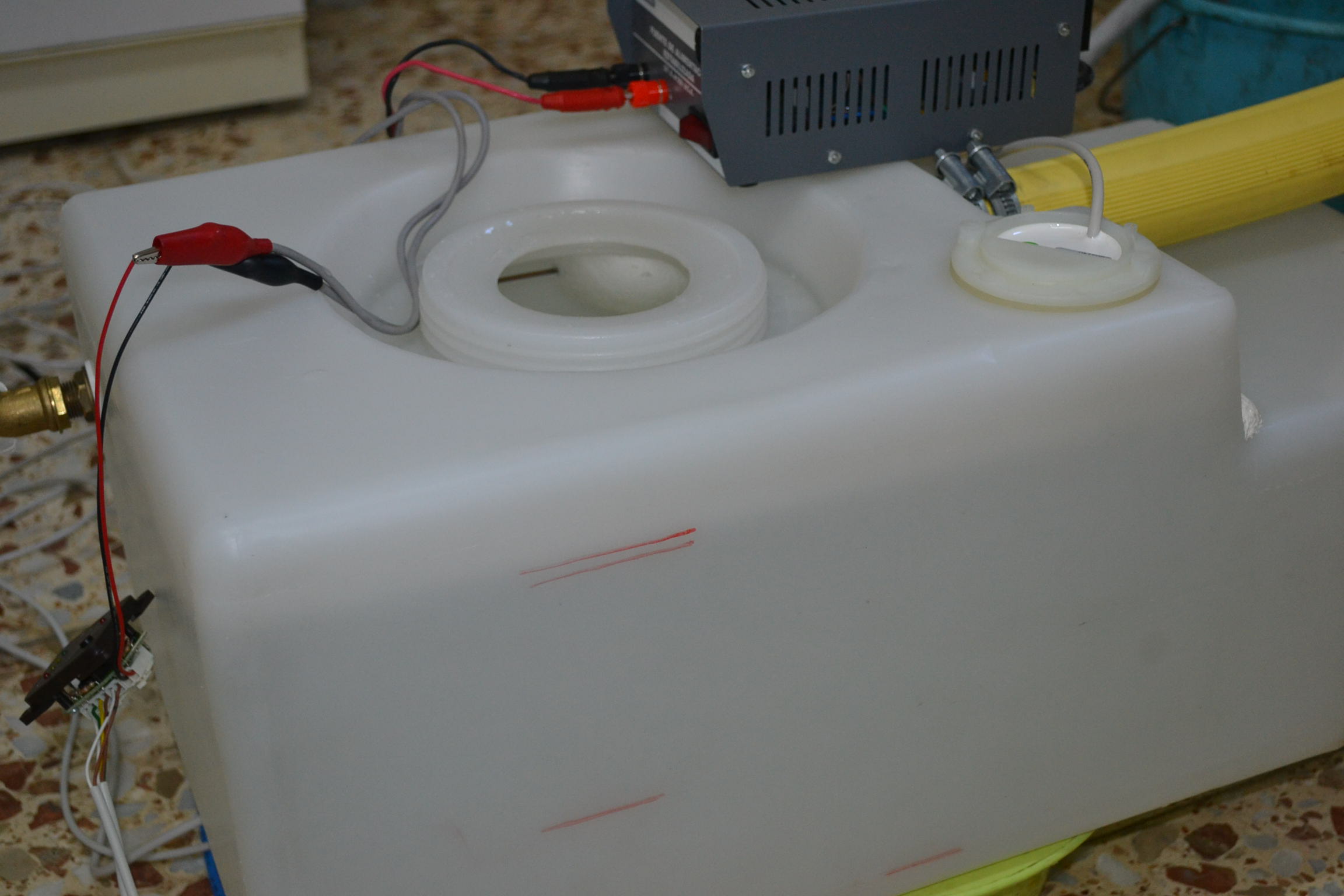 ...decidi situarlo en otra parte. En el lado opuesto de la salida del rebosadero; ademas los cables me quedarian en un lugar de mejor situacion para la conexion electrica. Tambien pense que hacer un "todo en uno" la bomba sumergible tocaria las varillas, ademas de que cada vez que decidiera vaciar el deposito a traves del tapon tendria que desmontar todo.