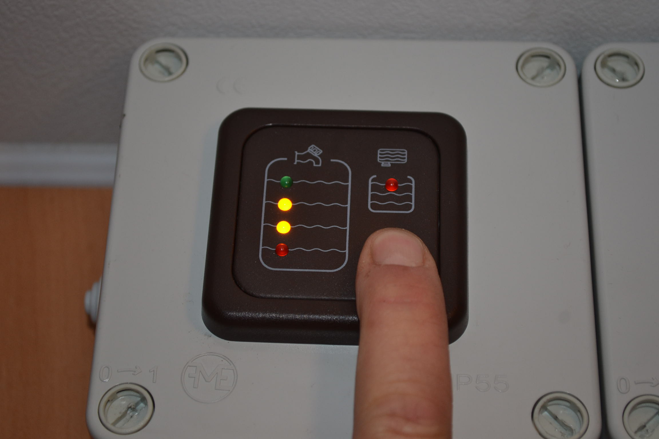 El indicador es para los dos depositos. Al deposito de aguas limpias hay que presionar el boton de testeo para ver a que nivel se encuentra; ese es un "aforador" como su nombre indica. El otro es un aforador "a medias"; se encarga de iluminarse por si mismo cuando su circuito se cierra a traves de los contactos de las sondas en el interior del mismo, actuando el agua como "interruptor".