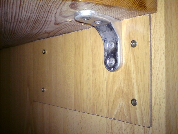 Quité la escuadra, coloque en la pared un rectangulo de restros de la tapa del arcon, le puse no mas clavos y unos tornillos y sobre eso, que ya de por si solo sujetaba el triangulo de pino del labavo, le atornillé de nuevo la escuadra.