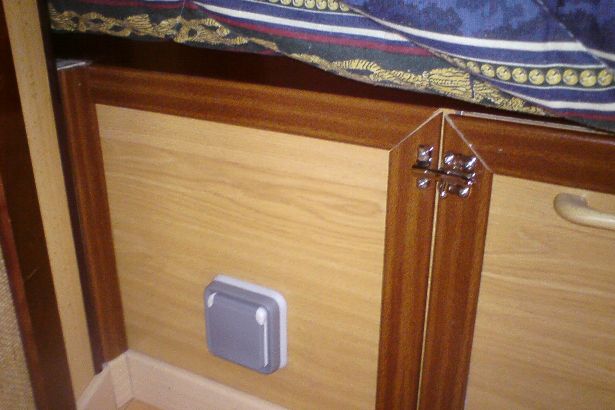 Ya que estaba en el arcon, coloqué el nuevo enchufe con tapa en el lateral del arcon, es nuevo por que el que tenia antes en ese sitio estaba algo perjudicado, el cable es el mismo que habia, tan solo he tenido que reforzar un poco donde lo he puesto por que esa madera es solo una tapa de fondo de armario, con no mas clavos le pegue un trozo de tarima de 15*15 por detras y le puse una caja de mecanismo de las que se usan para el pladur.