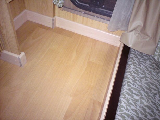 Por fin pude terminar la tarima, coloqué lo que faltaba, y puse el resto del rodapié. Aqui os muestro lo ctrre que ha quedado el remate de esta zona, como no tenia ingleteadora, no lo pude dejar mejor, para tres trozos se me hacia demasiado comparme algo mas, pero como no está en lugar visible (en un rincon cerca de las literas) no me importa mucho.