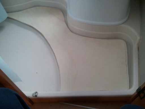 Este fin de sema he solucionado el problema del suelo rajado del plato ducha de la caravana. Hemos puesto plaque marino de 9mm , fibra,dos capas abajo y cuatro arriba ,despues pintado y polvo antideslizante.