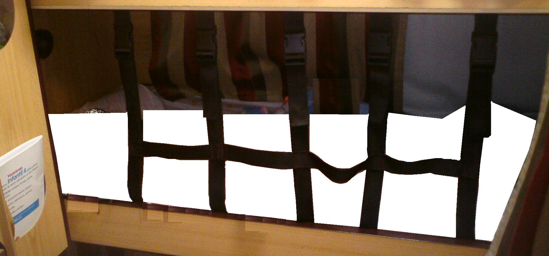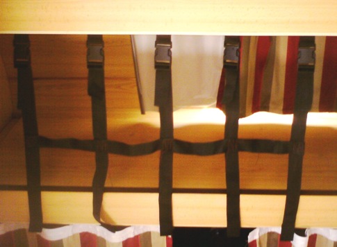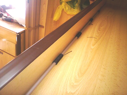 despues se desatornilla el tablero que hace de base de la cama mas alta,se meten las puntas de las cintas para poder poner la varilla, se ajusta de nuevo el tablero en su sitio y se atornilla de nuevo.