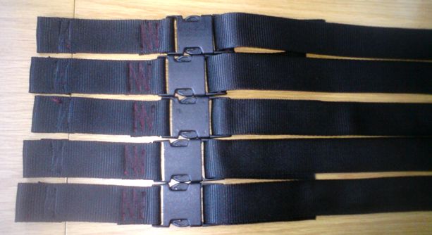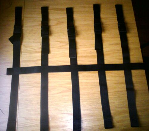 Compré unos metros de cinta y 5 cierres rapidos, hice 5 conjuntos como la foto, en los extremos lo cosí dejando un lazo o "bujero" por el qeu para la barra de aluminio