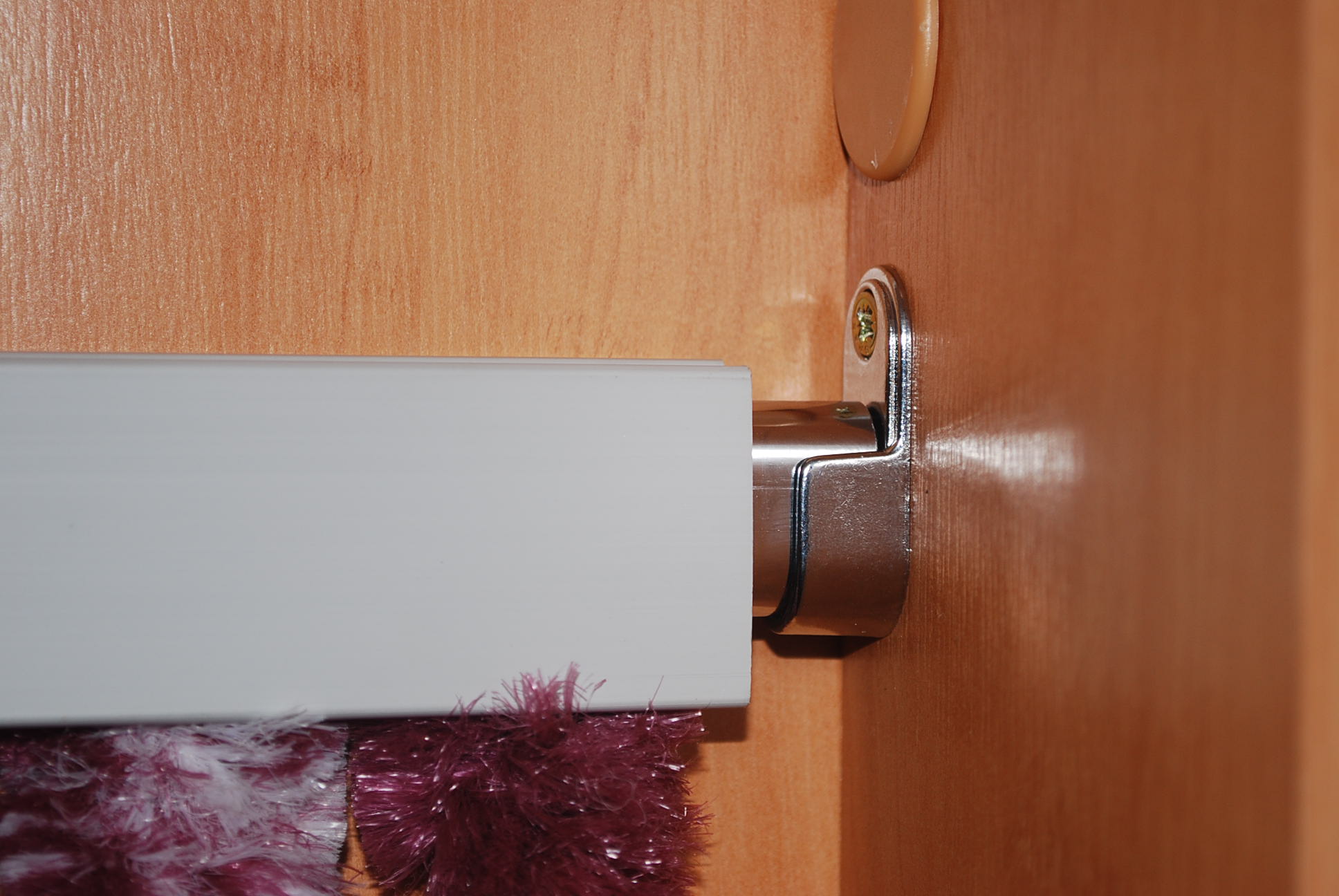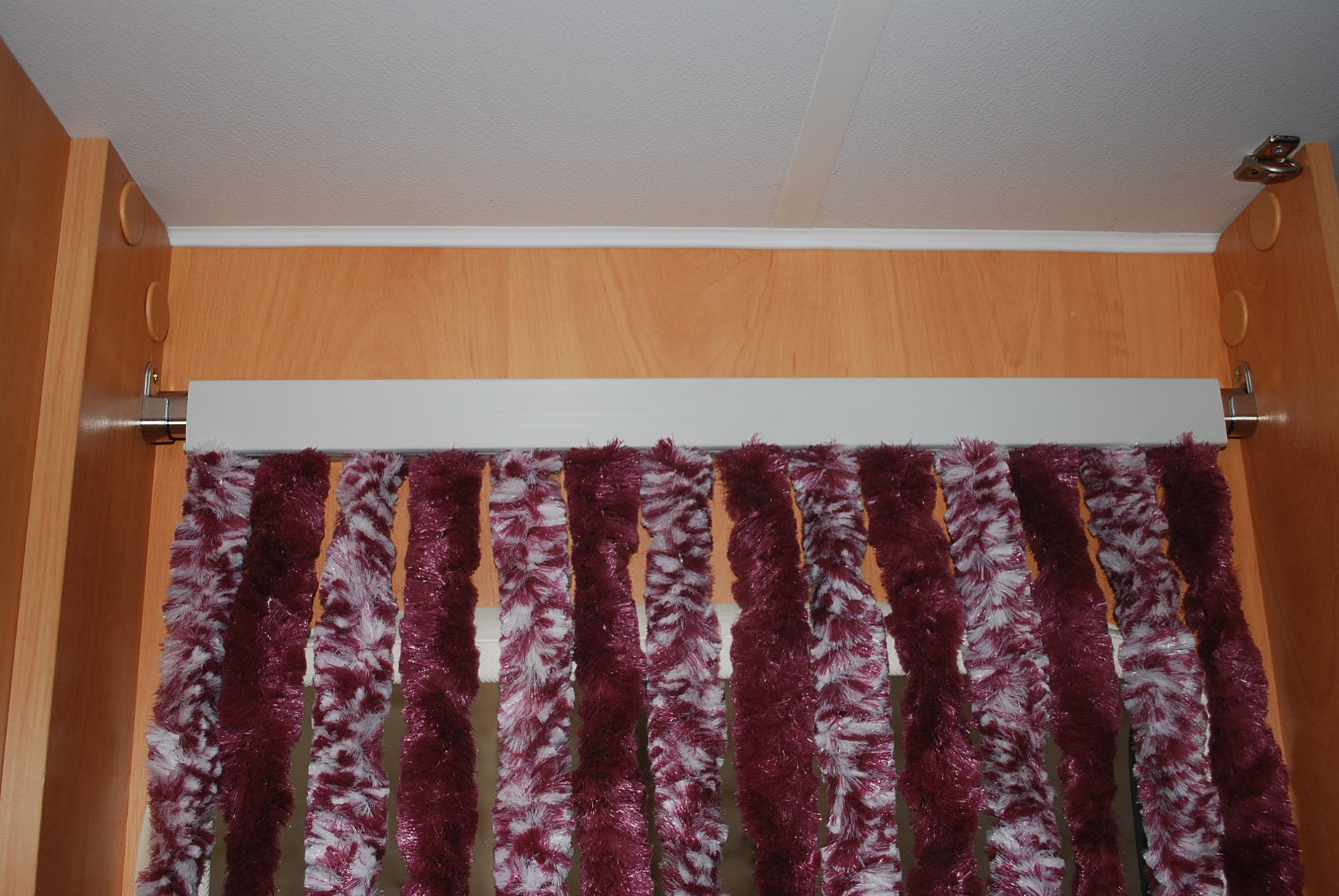 Pensé en utilizar una barra de cortina de 15 mm que pasase por el interior de la "caja de plástico" donde "nacen" las tiras. Esta barra iría remachada a esta caja con varios remaches (para que quedara "solidaria". Y la manera de sujetarse era como yo tengo estos tipos de barras que forman "zapateros" dentro de mis armarios de casa.