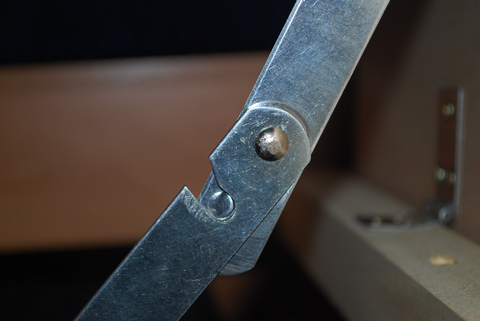 Hice los ajustes pertinentes en ambos "aparatos". Para que no saliera una parte de la bisagra del listón de madera donde va atornillada, y le corté un trozo , le hice un taladro y a éste le hice un avellanado. A los compases les hice con lima más acanaladura donde aprtretaría la muesca para que el ángulo que forman cuando están extendidos superara los 180 º, hasta casi llegar a los 120 º. De esta manera es muy difícil que salte una vez abierto, ya que el peso de la tapa lo aprieta .