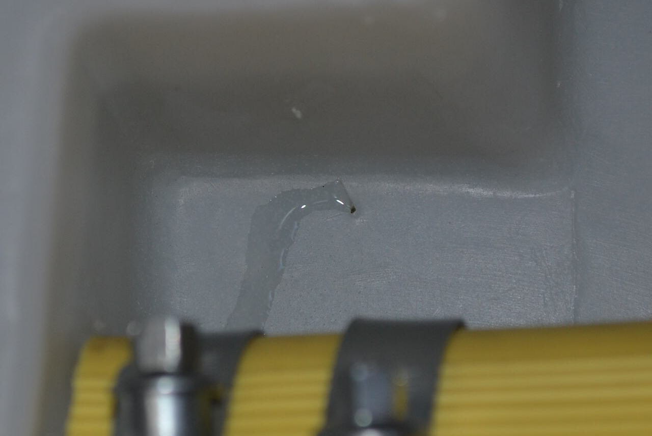 Resulta que cada vez que llenaba a tope el deposito observaba que habia agua en el suelo de la cv. Pensaba que el ajuste de la union entre el tubo de bajada y la boca de conexion del deposito no era bueno y por ahi perdia agua. Pero mi sorpresa al hacer las pruebas con el deposito desmontado vi lo que era en realidad: