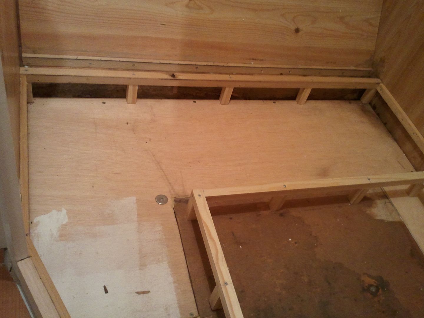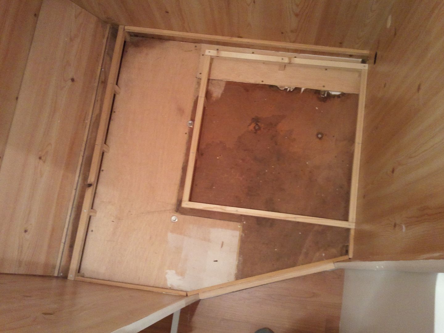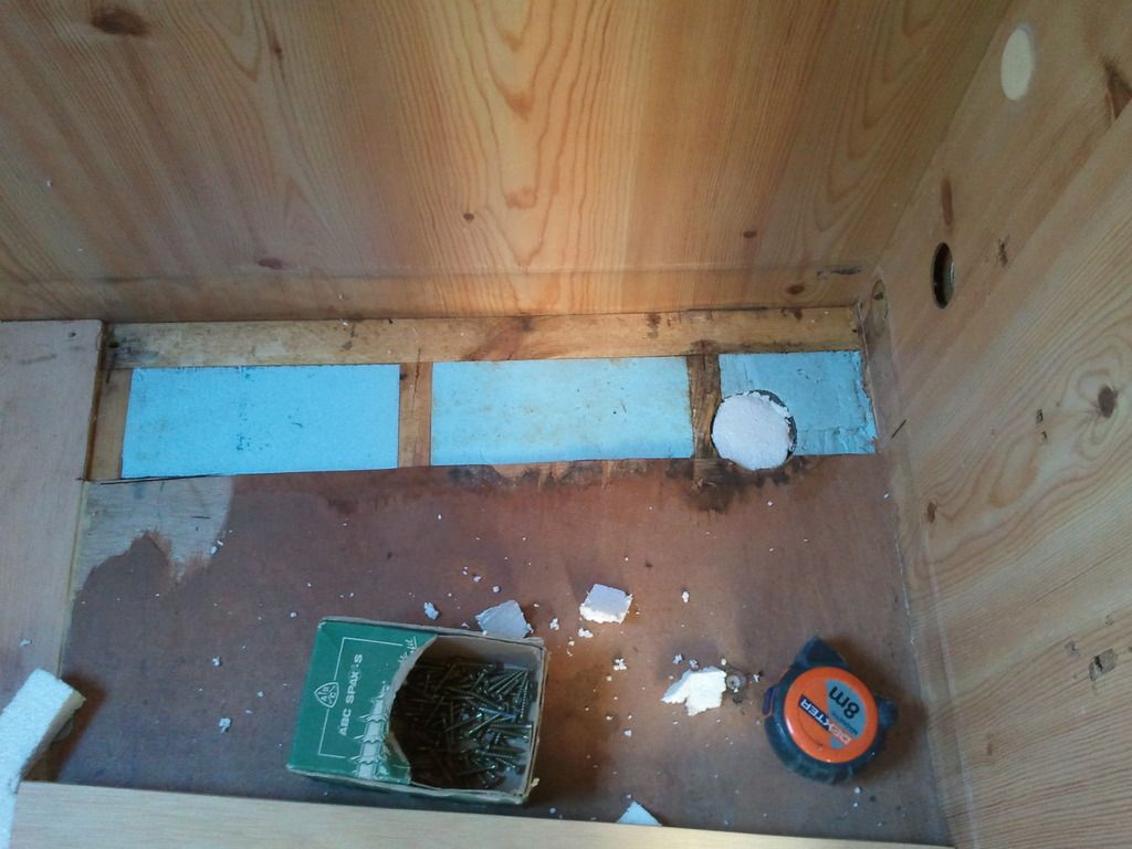 Empece ya con el WC. Lo primero que hice es cambiar un trozo de contrachapado que se levantaba y que estaba un poco mal y de paso tapaba el agujero del antiguo plato, ya que el nuevo lo hago en otro lado.