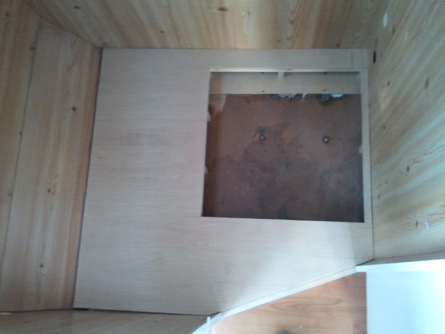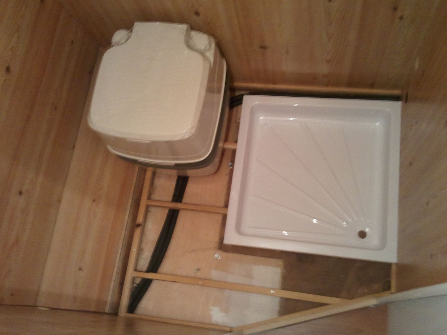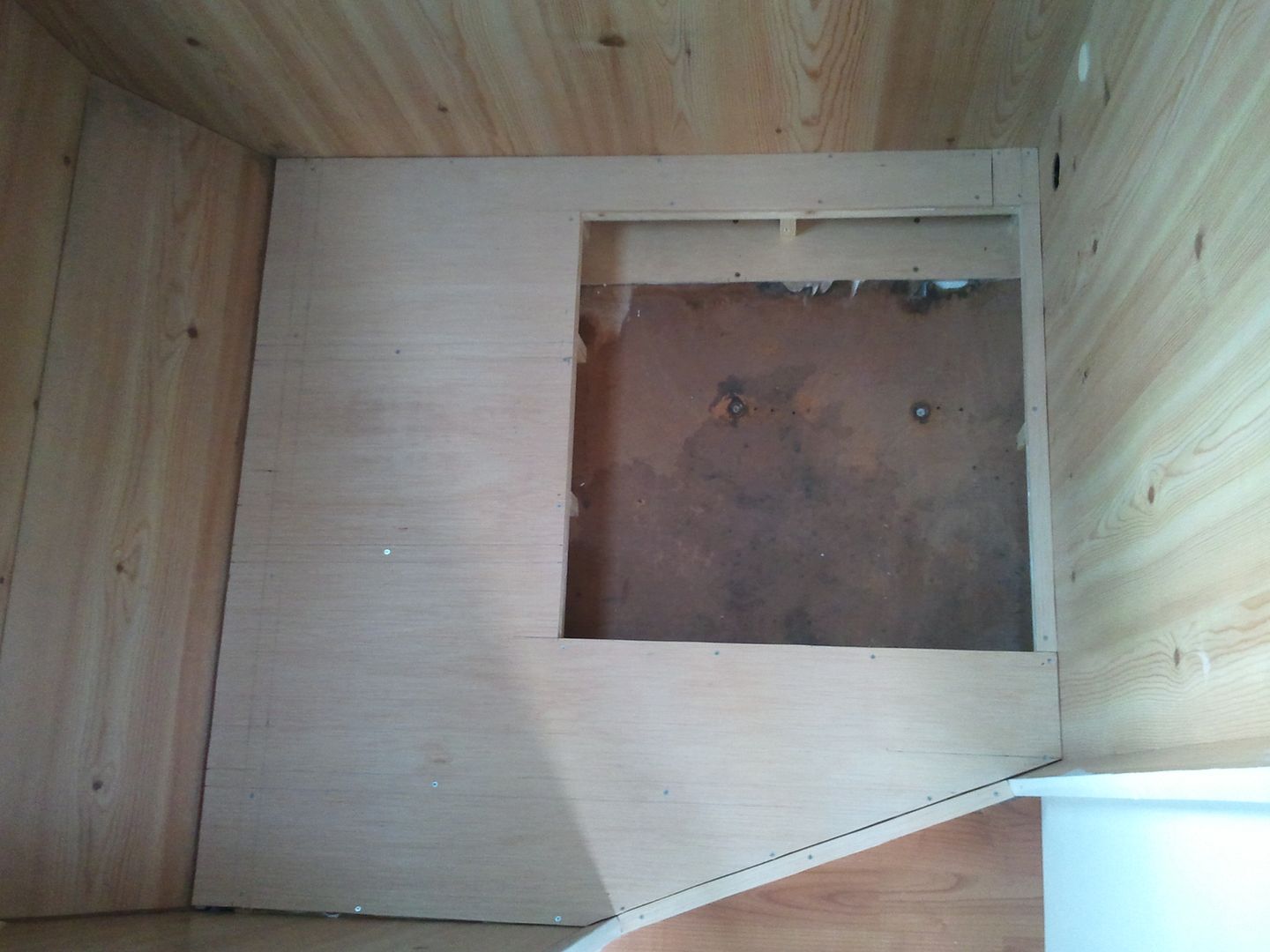Pues hoy he seguido con el WC. Aqui el nuevo suelo cortado me falta un trocito en esta foto. Al aprovechar maderas es lo que tiene. Solo esta sobre puesto, para probarlo.