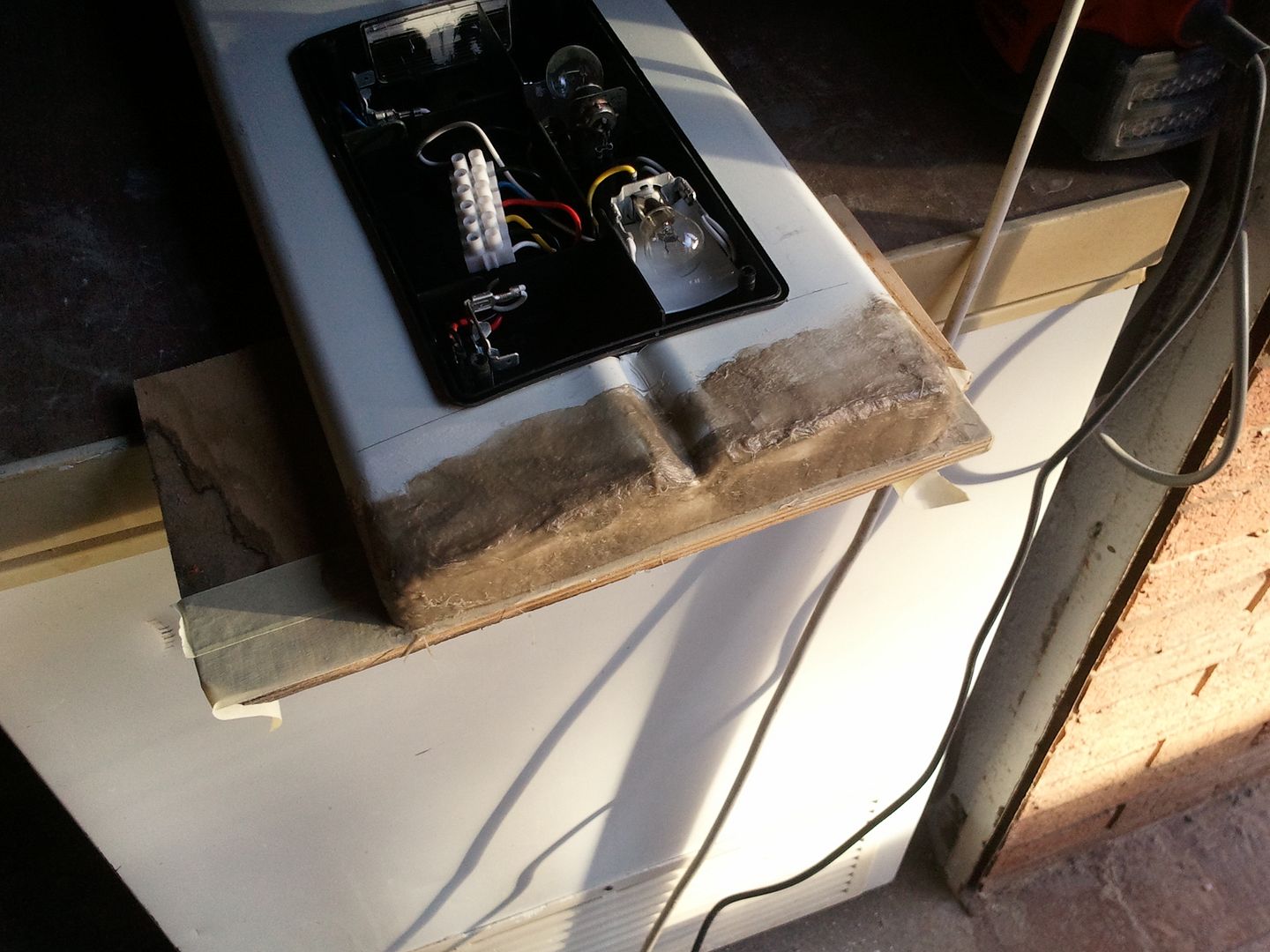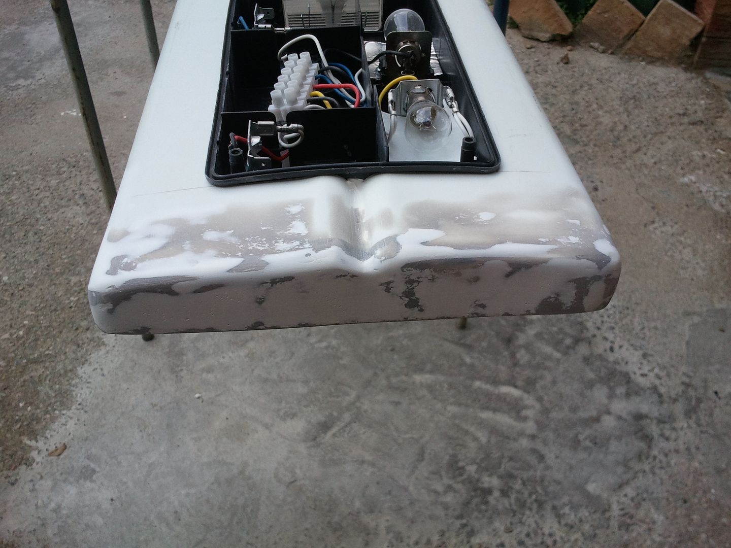 La caja de registro de debajo la cama, con la linea de enchufes y luz conectados.