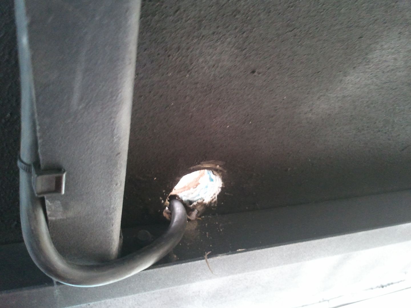 En este rincon he hecho el agujero que por aqui entra el cable de los pilotos y saldra el tubo del desague de la cocina y de la pica del WC. Luego bien sellado con silicona.