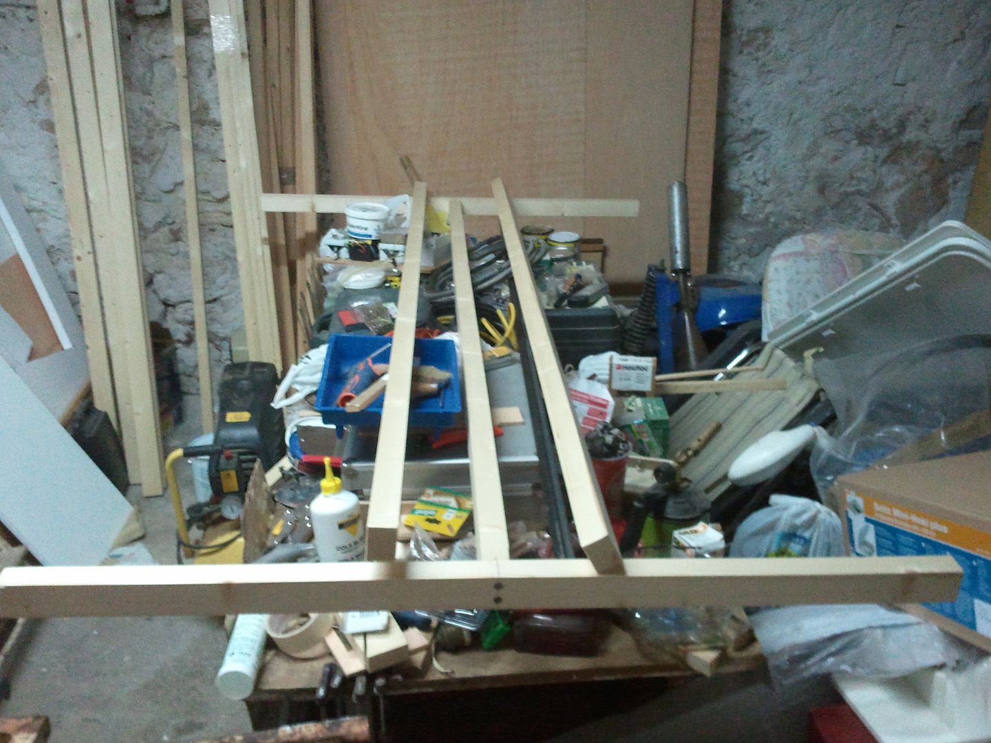 Estuctura del somier, que me lo construyo yo mismo a medida. De momento solo me falta cortar a medida los listones que iran en medio e iran a lo ancho. Lo que se ve en la foto es el liston central atornillado ya con los laterales cortos. Tambien se ven cortados ya los laterales largos.