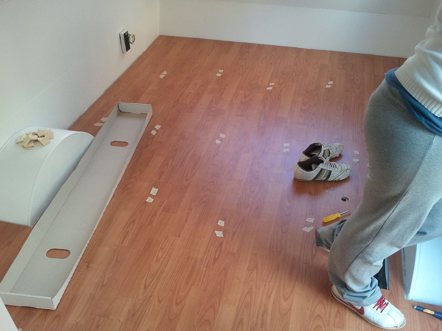 La tarima marcada para volver a poner cada trozo en el mismo sitio.