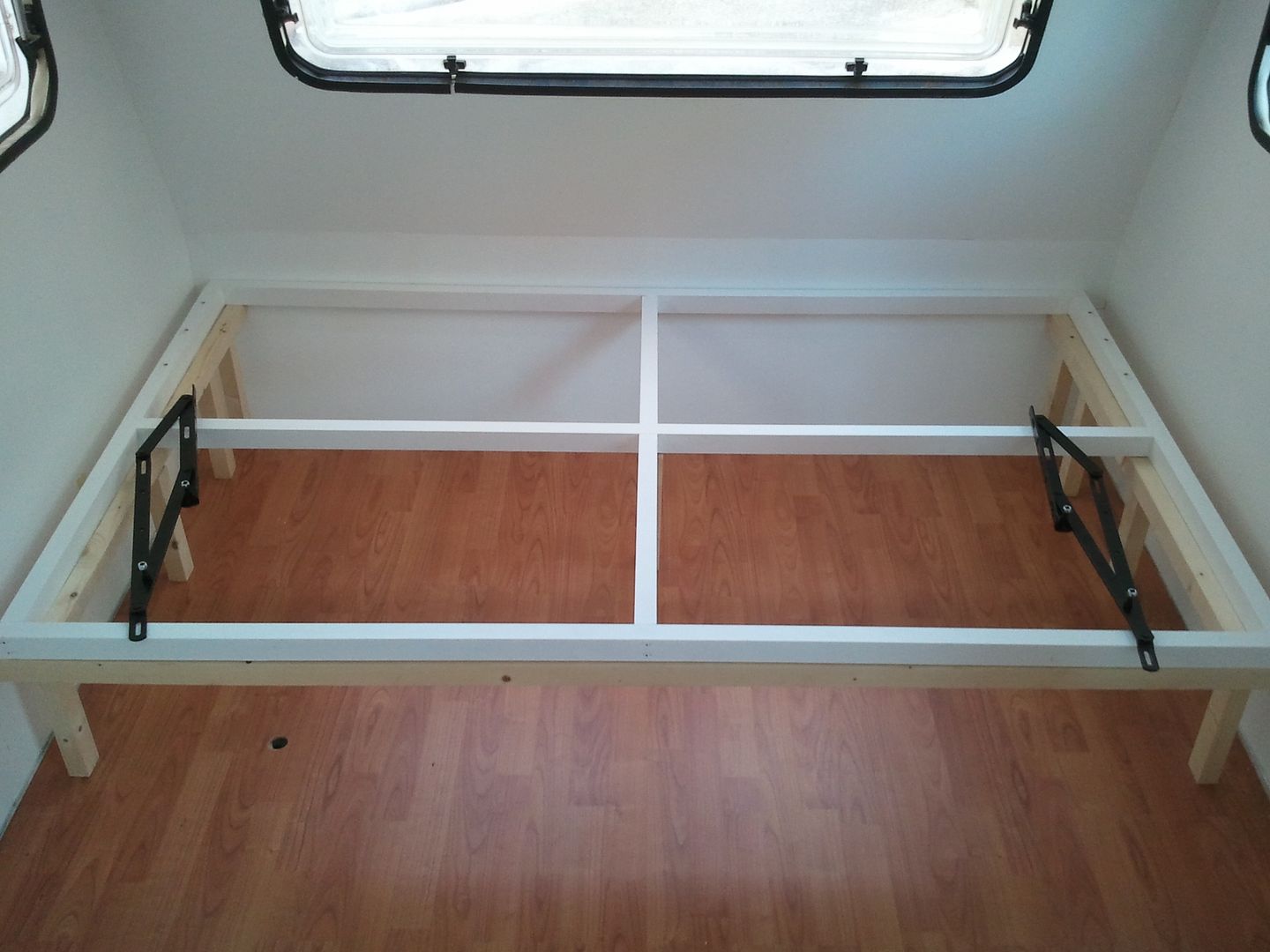 Las he puesto por dento, por la sencilla razon de ponder cojer el somier por la parte de abajo. Si ponia las patas hacia fuera y la bisagra dentro la cama se apoyaba en la bisagra y no en las patas como era mi idea. Es esta forma incluso queda mejor, por que los largeros apoyan directamente a las patas.
