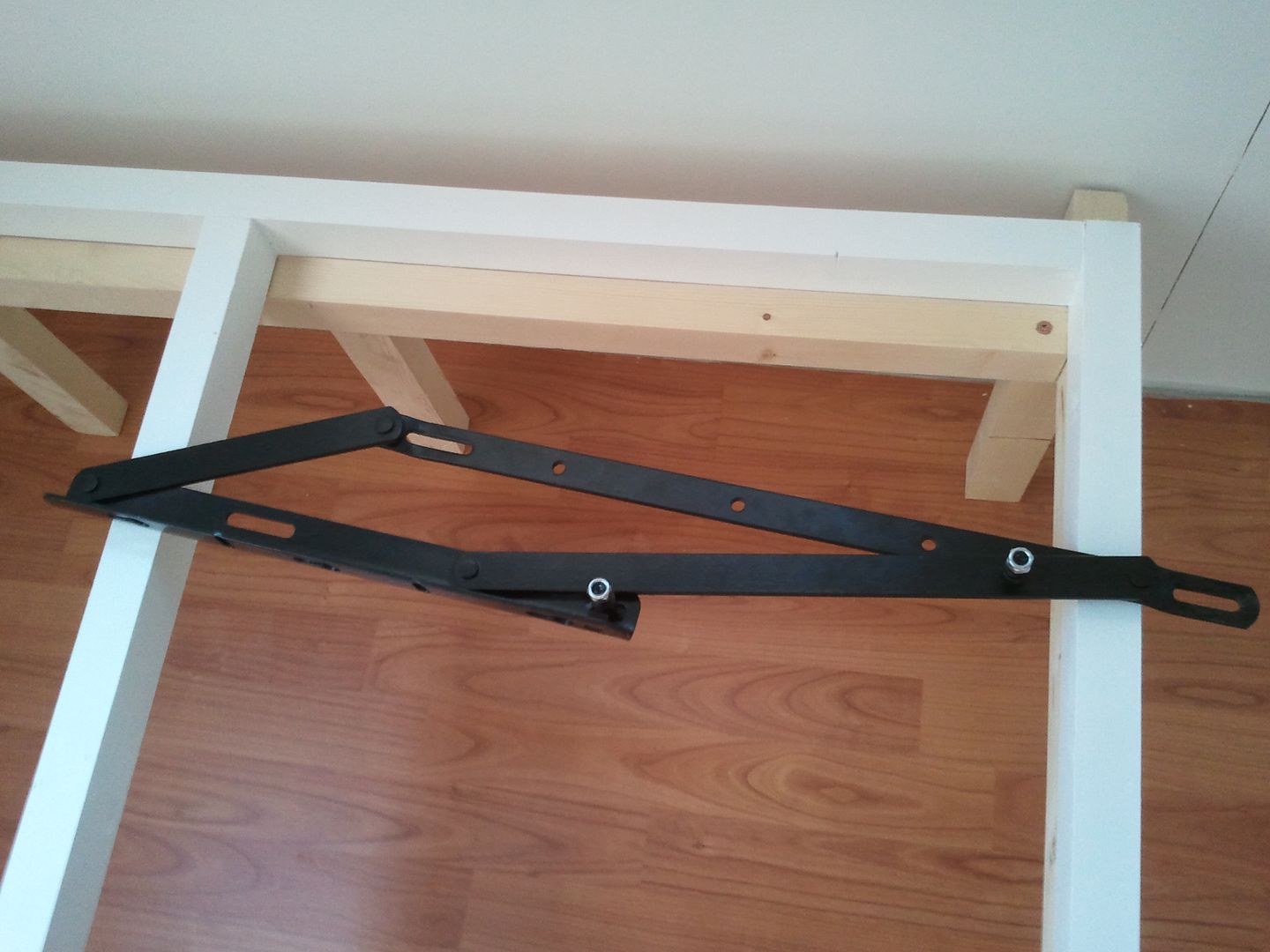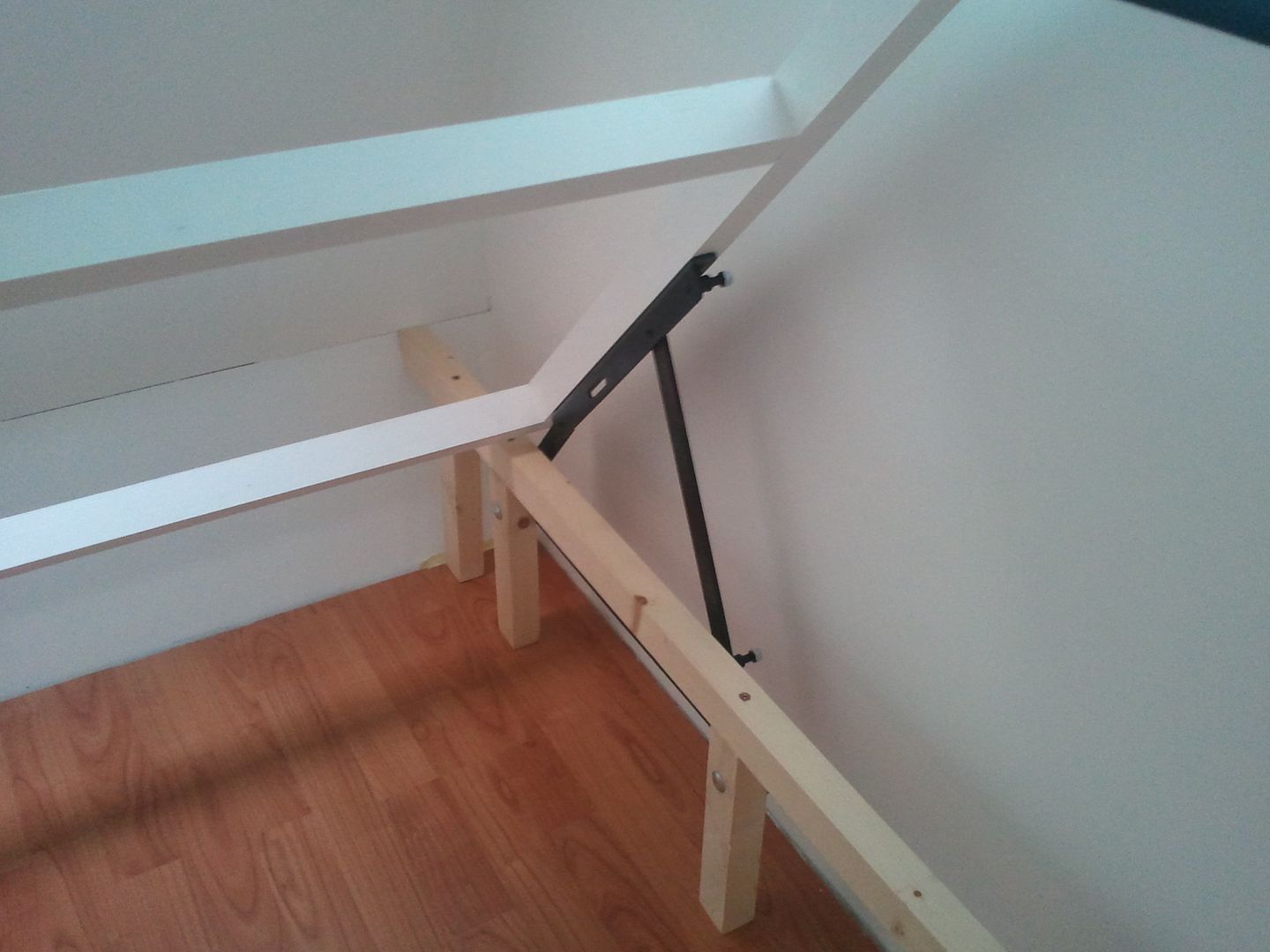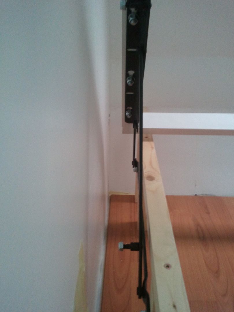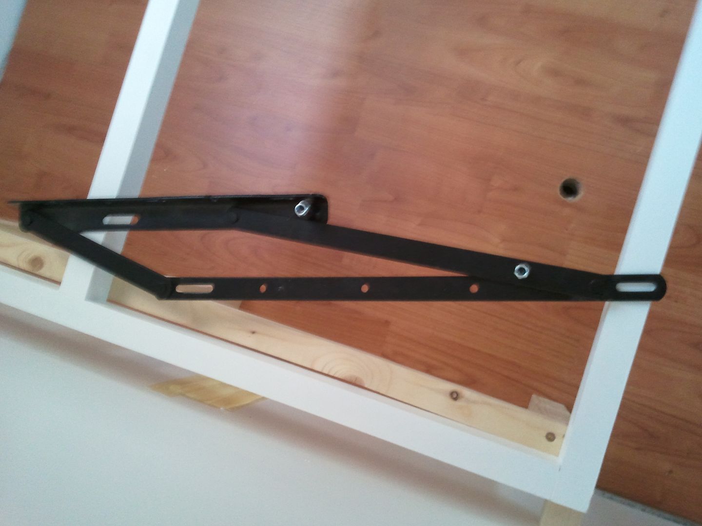Una vez pintado, me puesto como ayer con la cama. Despues de ir a cambiar esta mañana, 6 tornillos que los compre cortos. Pues hoy ya he podid poner las bisagras. En esta foto que ve mejor el apoño del medio, ya que en las de ayer no se apreciaba. Hoy que cogido el angulo bueno para que se viera. A falta de fijar las patas asi quedan las bisagras puestas.