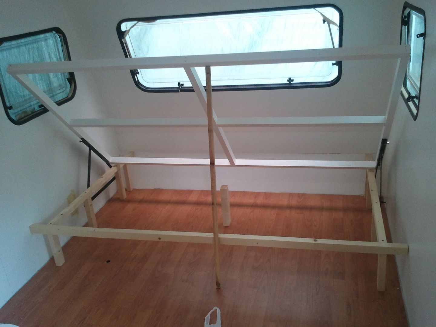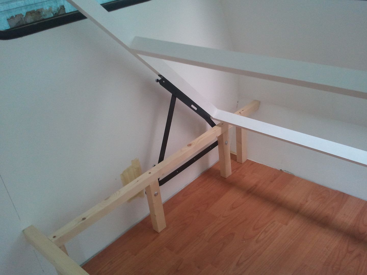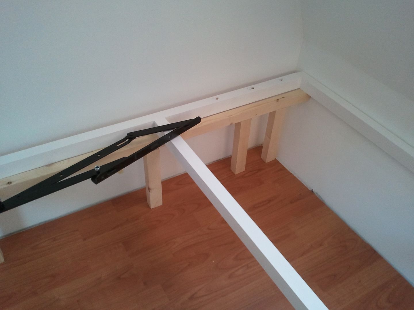 Una vez pintado, me puesto como ayer con la cama. Despues de ir a cambiar esta mañana, 6 tornillos que los compre cortos. Pues hoy ya he podid poner las bisagras. En esta foto que ve mejor el apoño del medio, ya que en las de ayer no se apreciaba. Hoy que cogido el angulo bueno para que se viera. A falta de fijar las patas asi quedan las bisagras puestas.