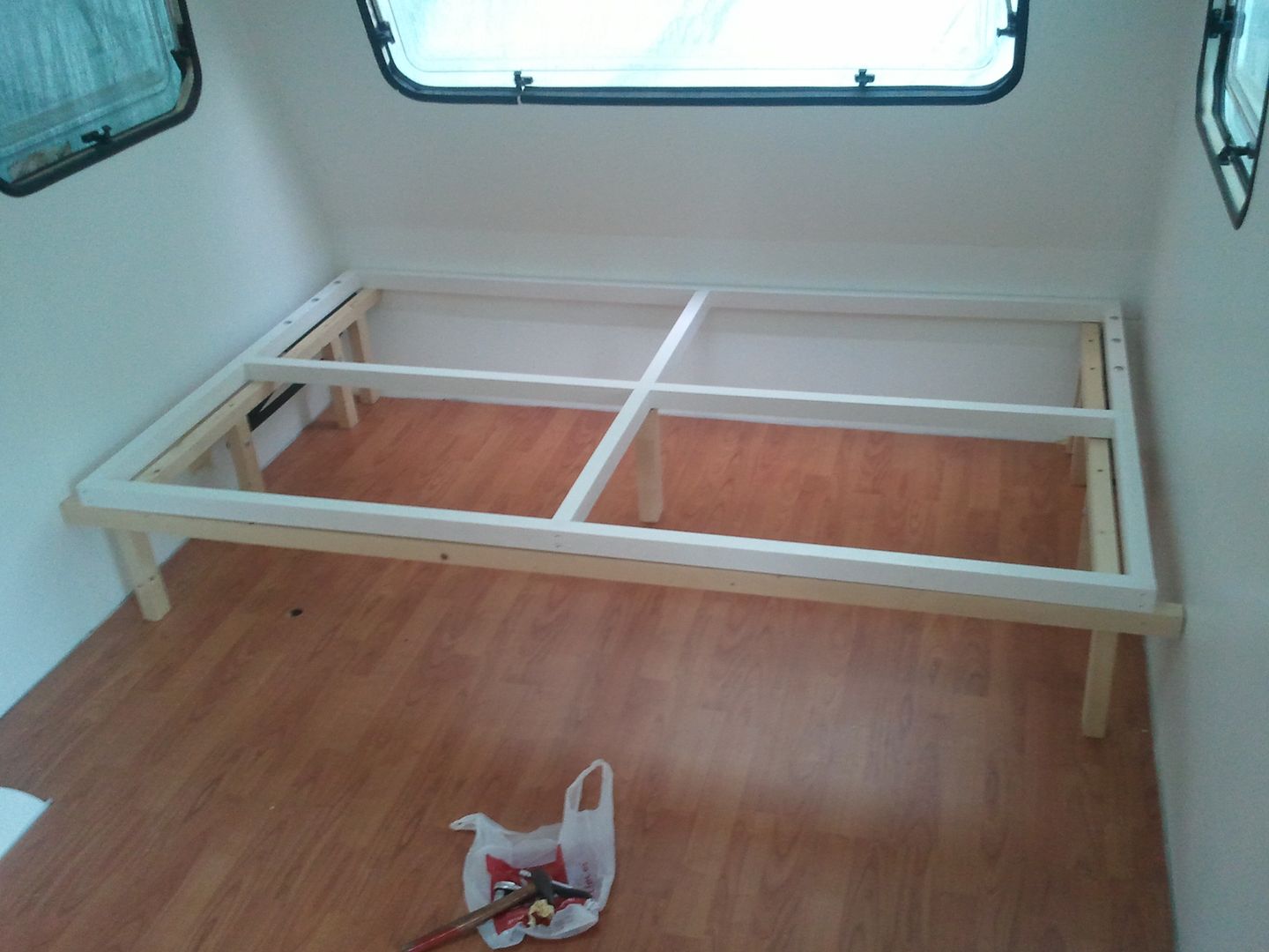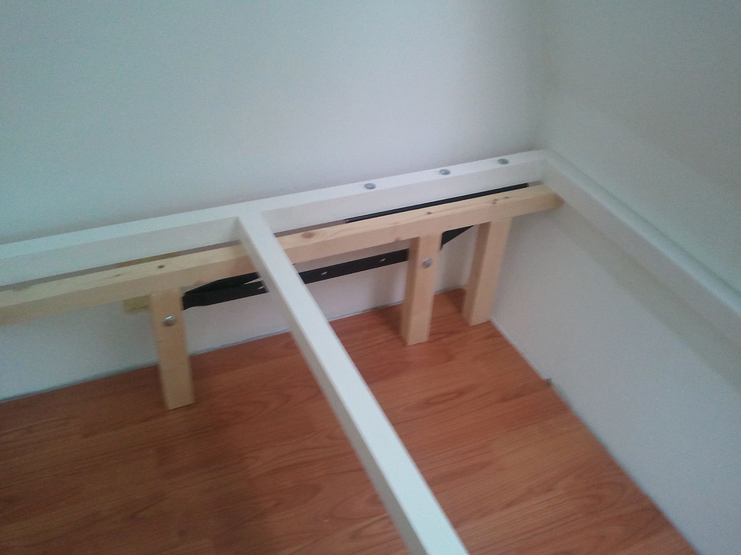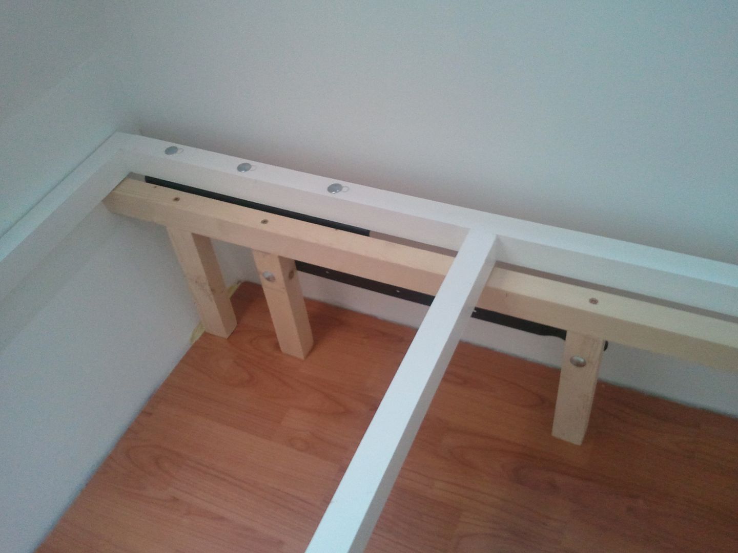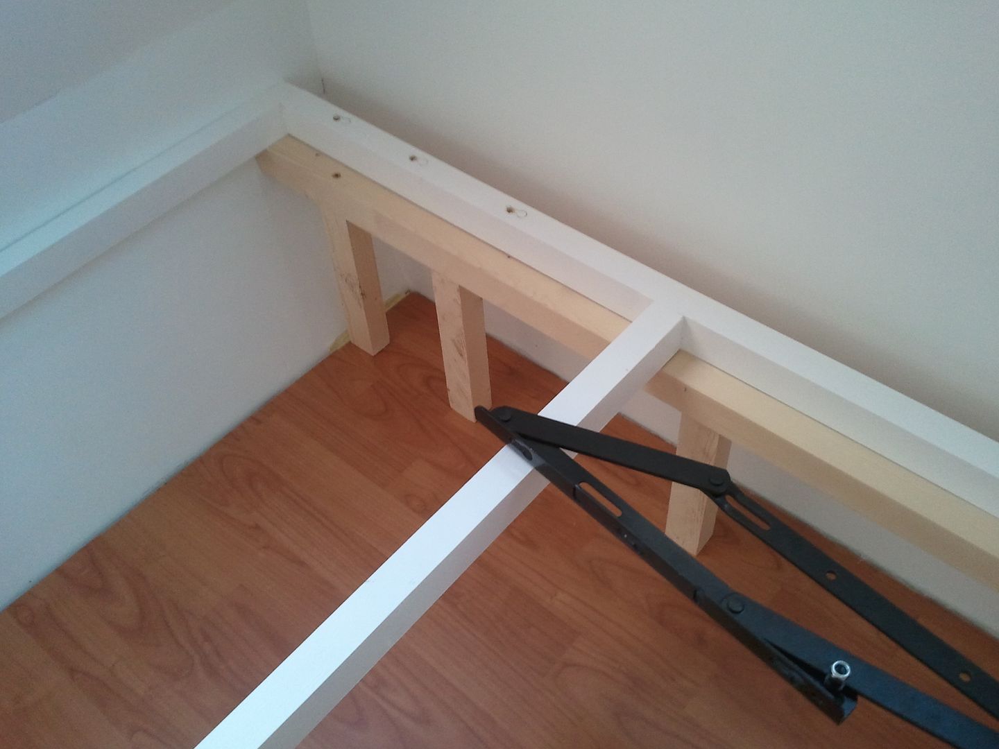 Cuando acabe de pintar y limpiar lo utencillios, me puse con la cama. Prepare para poner las bisagras de canape. Esta mañana compre los tornillos, pero me equivoque en la medida de unos y no pude poner las bisagras al somier, asi que hice las patas donde ira cojida la bisagra, y lo presente para ver como quedaria una vez terminado.