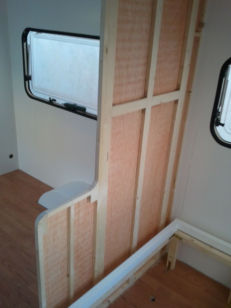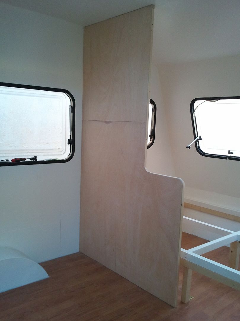 La pared grande. Como veis esta en dos partes, por que cuando compre el contrachapado tube un percance son el transporte, y se me partieron las 5 que compre y ahora se me quedaron cortas. Luego no se vera porque a esa altura va el liston de apoyo de la litera.