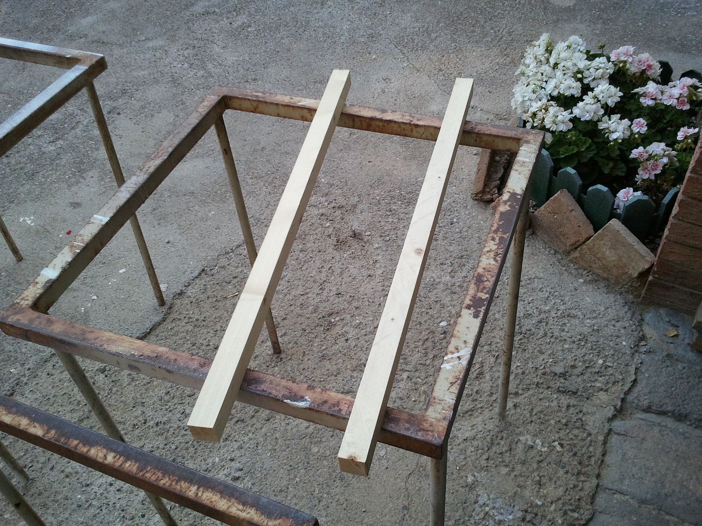 Y esto con los listones que he cortado a medida, que seran donde se apoye la litera. Estos como otros los he cortado de un liston de 45x60mm con le que iba hacer la litera en otro lado, y para aprobecharlo lo corto a lo que necesito.