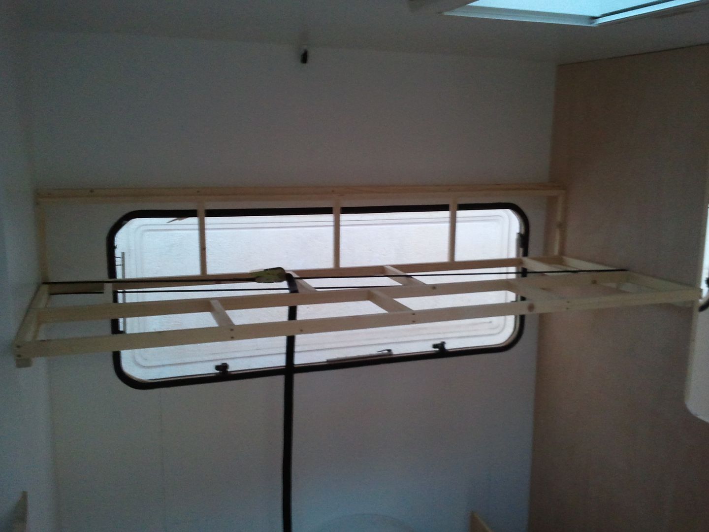 Despues de todo los percanses, acabo de contruir parte de la litera al comprobarlo en la caravana, MEEEECCC roza al subirlo hacia arriba que es donde ira recogida la litera. Total que lo "facil" seria mover un poco de arriba la pared grande que contrui. Pongo entre " facil , por que no a sido asi. Porque los tronillos los atornille con inclinacion para que cogieran bien al liston de techo, dicha inclinacion estaba echa desde el "salon. Que pasa que al esta el contrachapado con el tornavis poco podira hacer para sacar los tornillos. Asi que me toco sacar lo maximo posible y luego con unas alicates ir desenroscando, hasta sacarlo!! Una vez sacados un par de golpes y solucionado.