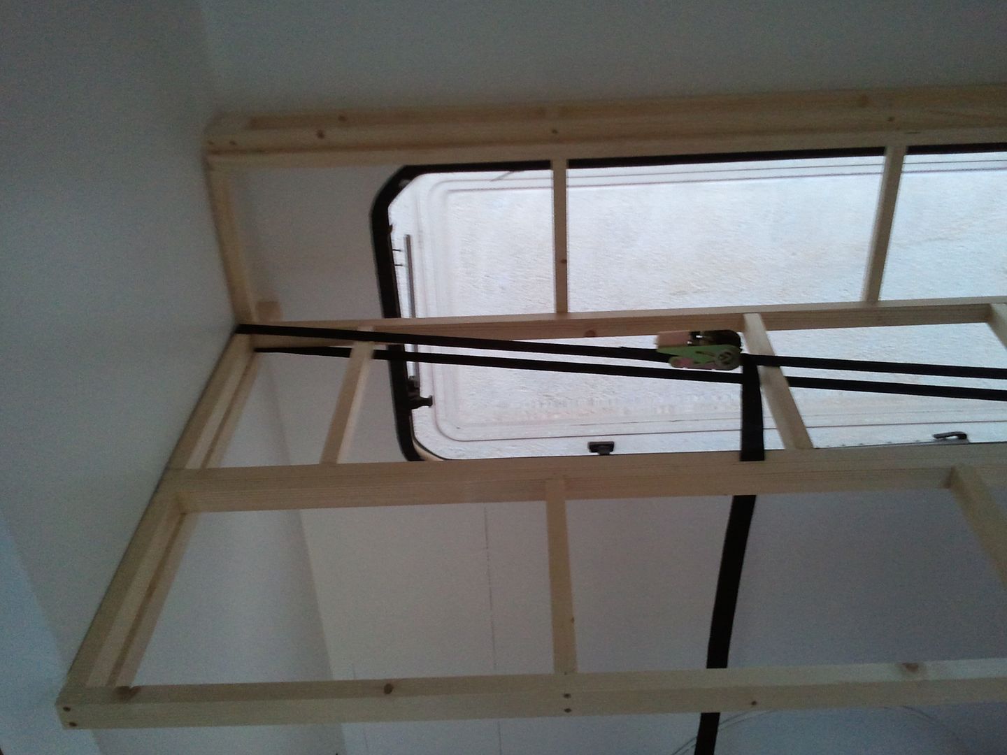 Aqui con las tres parte (en total 4 otra esta en la caravana) la de la derecha es ultima parte y tambien es la base ("somier") La del centro tiene una cinta porque me a quedado un poco descuadrada (por los problemas)