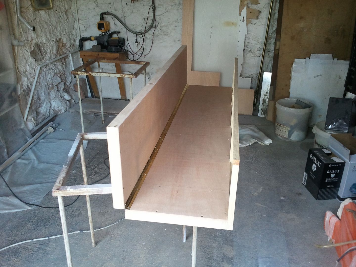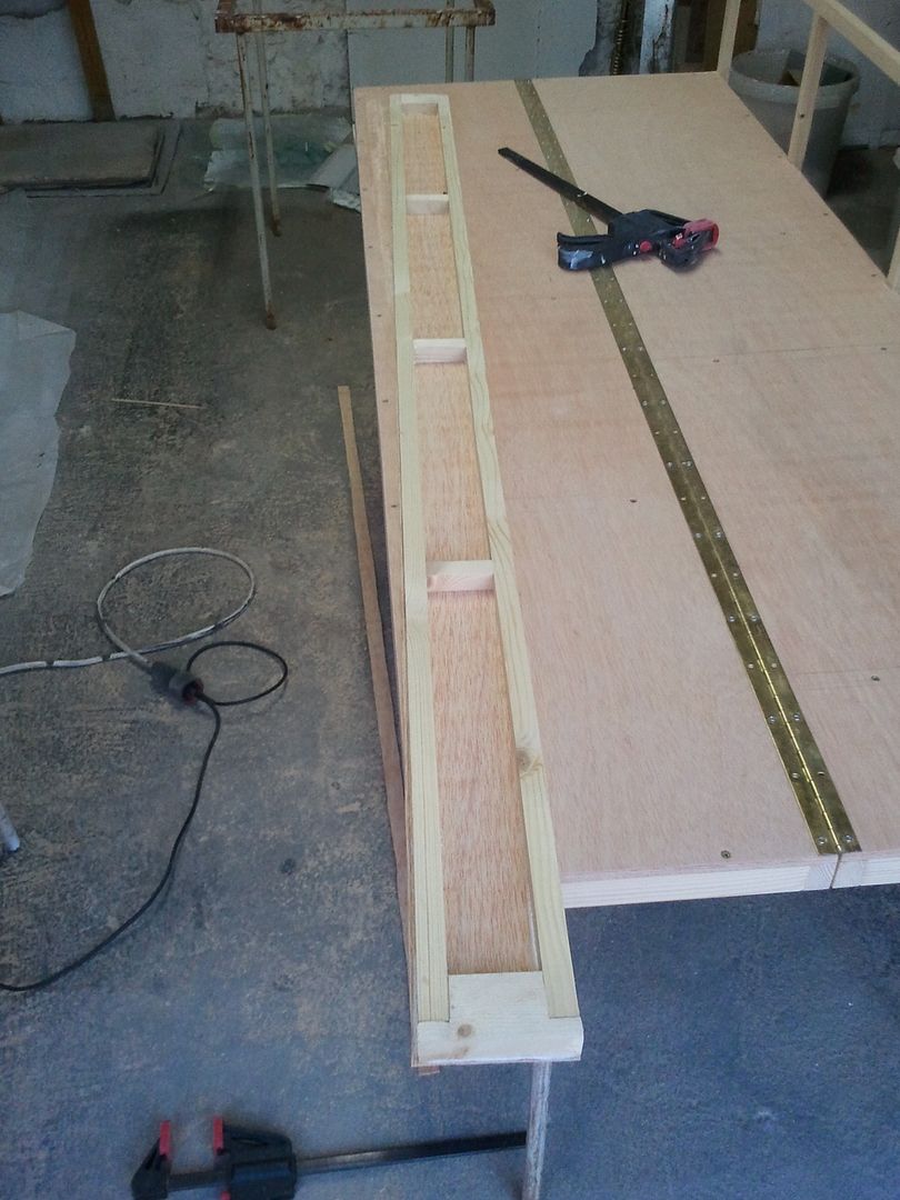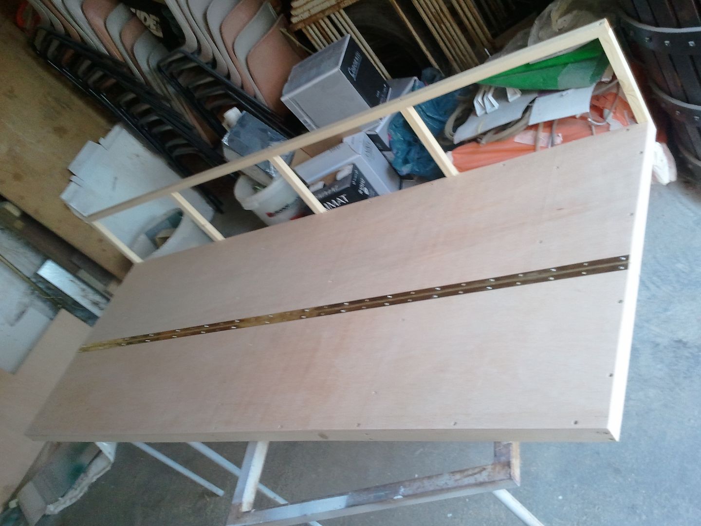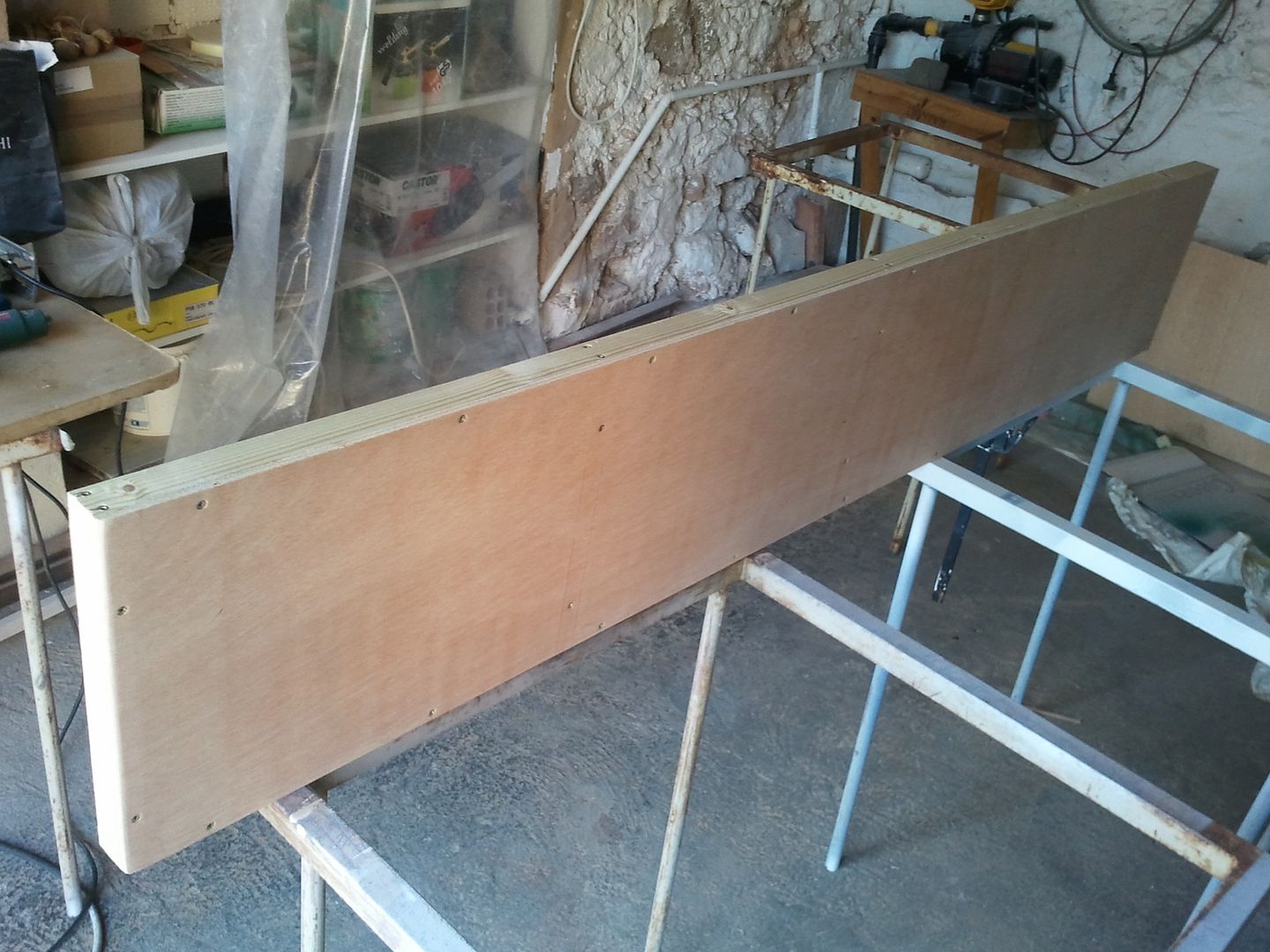 Pues hoy tocaba contrachaparla! Aqui la primera parte cortada y contrachapada, con contrachapado de 8mm. Por debajo ira de 3mm, simplemente para tapa. Arriba como tiene que aguantar peso le puesto el de 8mm.