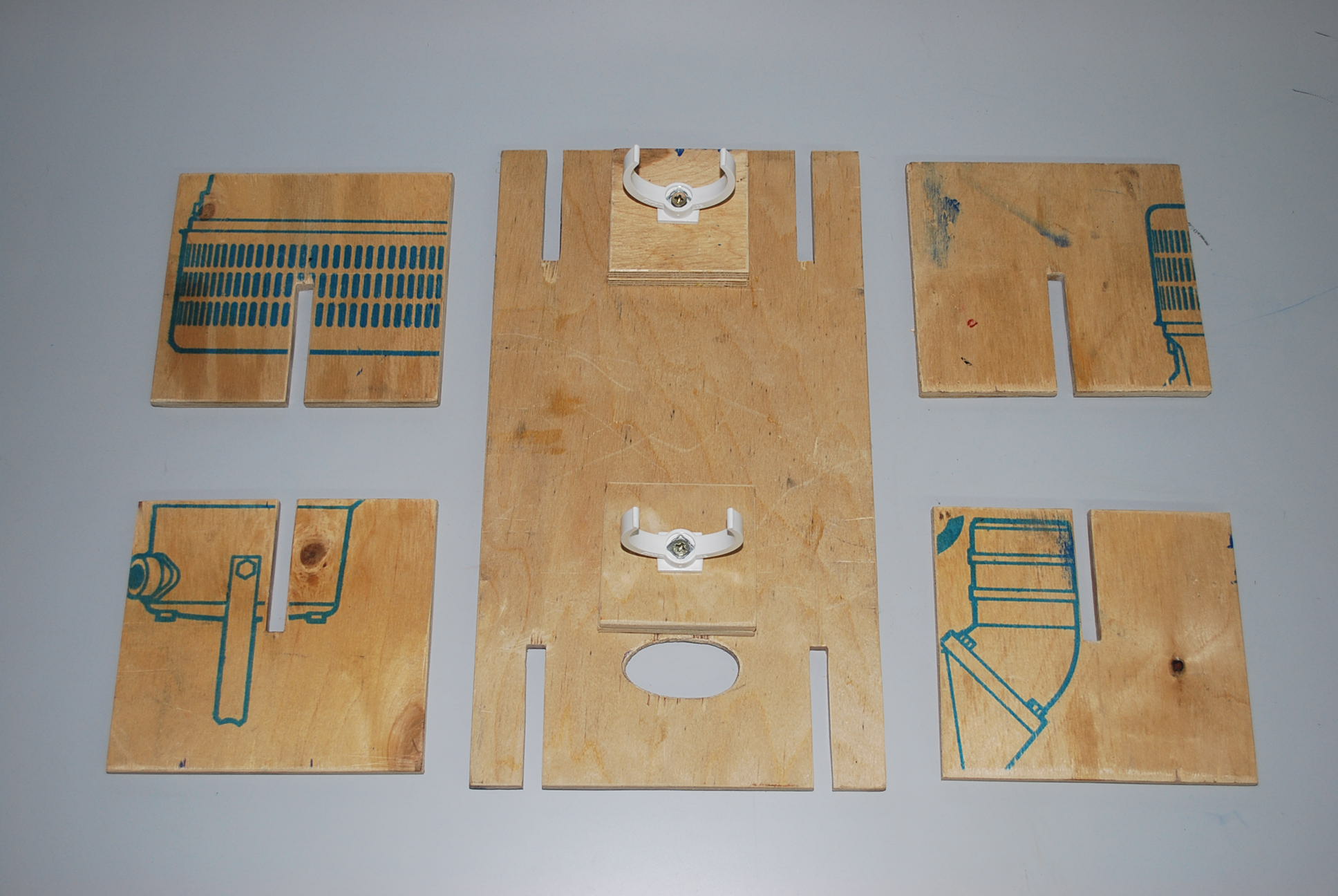Está hecho a partir de una tapa de un cajón de embalaje de madera "plafonada o contrachapada". Es de 9 mm de grosor y, quizás, de mala calidad..., pero como era para un ensayo no me importó; ni siquiera los acabados de los mecanizados en madera son dignos de ser presentados...!!!