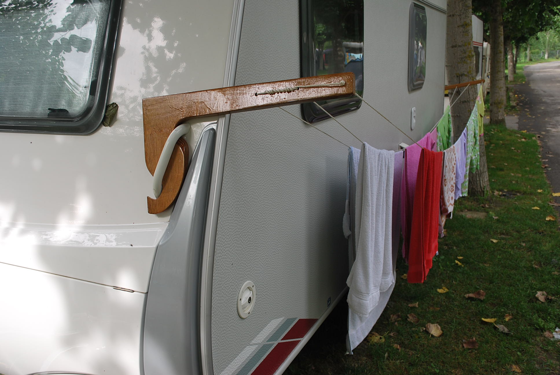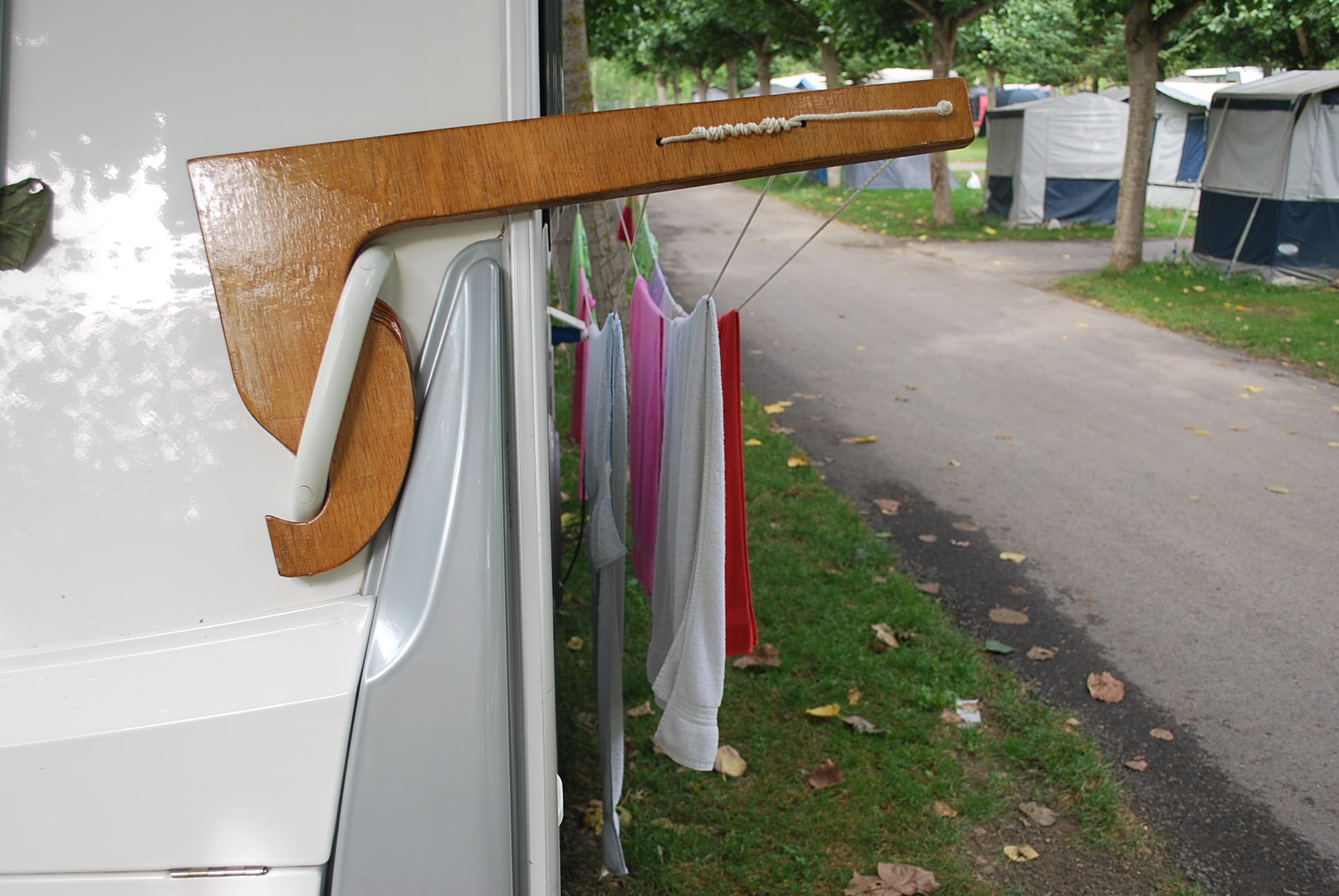 Este brico es la consecuencia de un accesorio ya inventado, que se vende en las tiendas de campismo. Se trata de dos maderas que se cruzan en el asa de cada lado sobre el lateral exterior de la cv.