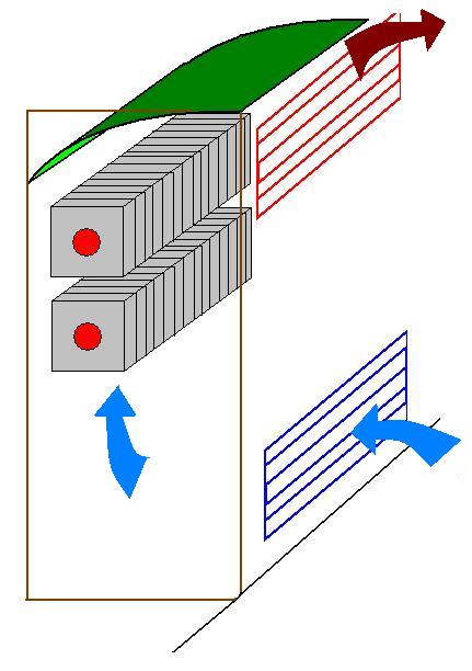 Hola de nuevo colegas. Estamos casi haciendo un tratado de física de algo tan sencillo como ayudar anuestras neveras a que trabajen en mejores condiciones. Bien, todos los aportes son buenos, con tal de que ayuden a que se mueva más el aire dentro del habitáculo de la nevera. En cuanto a este sistema en tándem de la foto, fijaros por un momento que si ponemos un tabique entre los dos ventiladores hasta el radiador aumentaría un 25% la eficacia de la refrigeración. y decir que en cualquier circuito con turbinas o ventiladores es más importante la aspiración, que la propia impulsión. Hago referencia sobre ese apunte sobre la refrigeración del procesador del PC, yo también lo tengo así y así es como debe de ser, es decir, tiene que haber garantía de que el aire que entra es el que nosotros queremos, en este caso de afuera y no importa que haya otros ventiladores sacando, eso es secundario. Falta decir que ese dispositivo que se acopla al ventilador tiene forma de troco de cono, más estrecho al contacto con la turbina y más ancho en la aspiración, para eliminar las turbulencias. De todas maneras os diré que todo esto en pequeña escala no tiene problemas, es puro bricolage y nos entretenemos de paso que aprendemos algo y a disfrutar que son dos días. Hasta otro momento. Ah y con la llama del gas ningún problema porque entre aire por abajo, yo tengo un amigo que la pone en ruta y sin problemas.