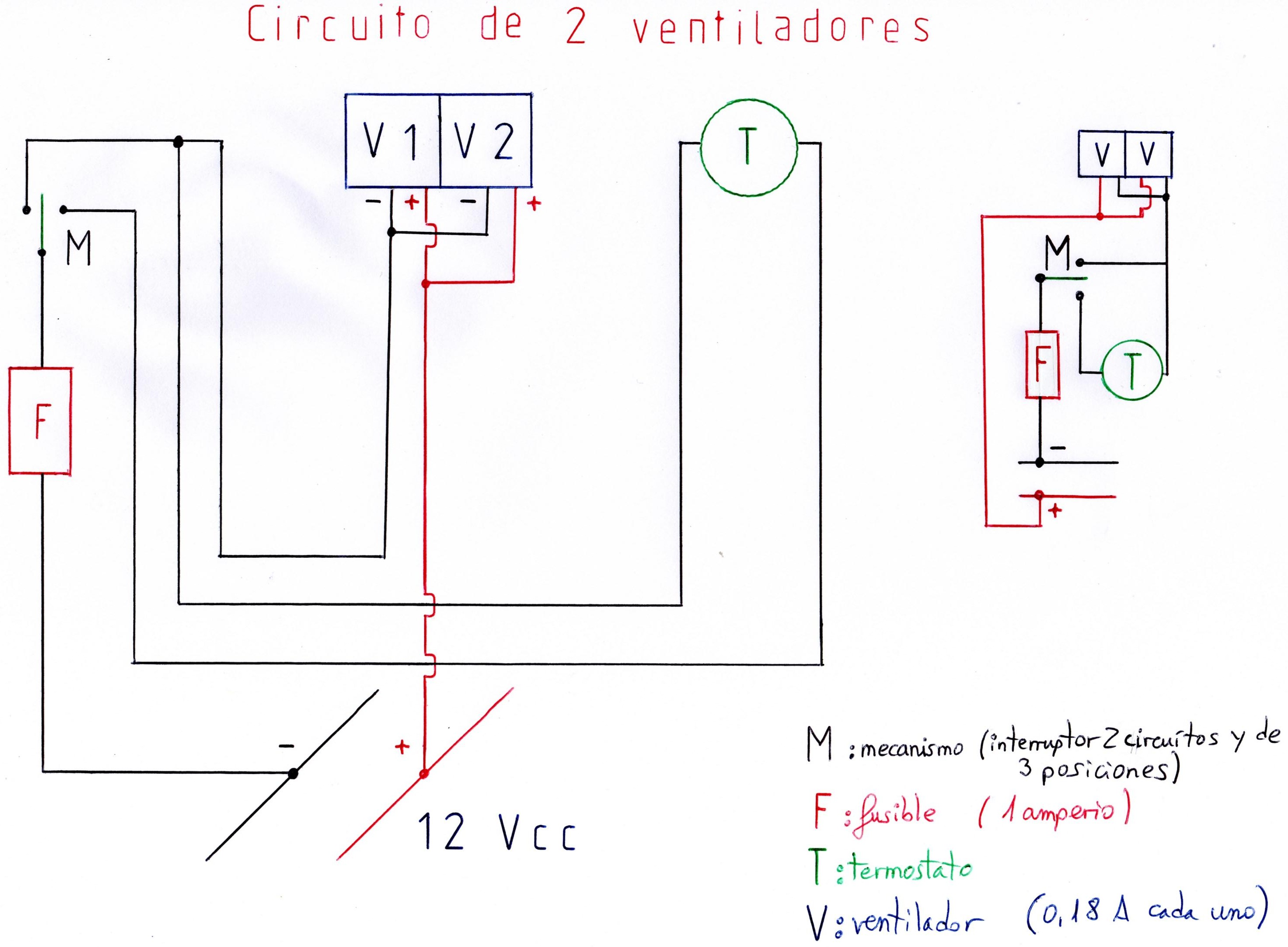 Hola de nuevo. Por otra parte, Juan, dos ventiladores acoplados como los tienes tú, bajan mucho el rendimiento, pues crearían turbulencias en la aspiración. Es preferible poner uno a cada extremo o bien uno en la rejilla de abajo metiendo aire y otro en la de arriba sacando, esto sería lo mejor y por supuesto siempre arrimado a la rejilla lo más posible. Yo lo tenía sujeto con bridas blancas a la propia rejilla y la verdad que le sacaba rendimiento. Lo del circuito, muy bien, pues por la noche no siempre es necesario y entonces se puede apagar. Un saludo
