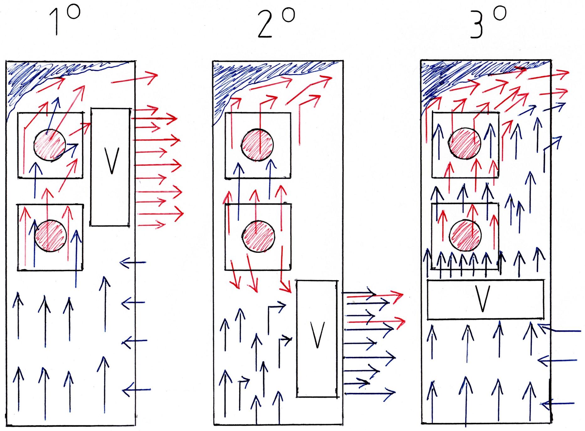 El aire frio proviene del "tunel" y, quizas, de la parte inferior de la rejilla ( del exterior ),. Este incide directamente sobre el radiador y crea un flujo ascendente por el que subiria a la parte superior de la rejilla el aire caliente y, quizas, algo del frio; pero que contribuiria a la ascension de todo el conjunto del aire, en su caso.Tambien el aire frio que pasa a traves de los ventiladores refrigeraria, en parte, a ellos mismos. En el 1º estos no se refrigeran con aire frio.