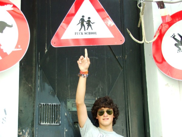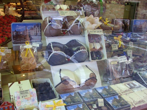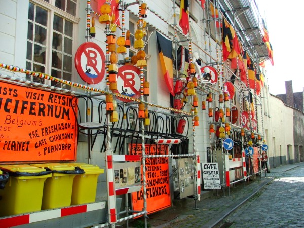 En Brujas encontramos este bar con una decoración digamos peculiar. Estaba cerrado, así que no pudimos verlo por dentro. Al chaval le gusto la señalde la entrada.